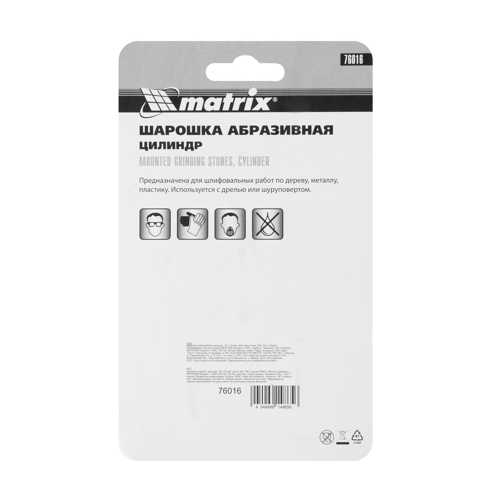 <p>Шарошка абразивная Matrix 76016, 32 х 32 мм, с хвостовиком диаметром 6 мм, 3шт., имеет форму цилиндра и покрыта крупнозернистым абразивом F46. Предназначена для очистки прямолинейных поверхностей, расширения отверстий, снятия фасок и удаления заусенцев. Она используется в качестве оснастки на дрелях, шуруповертах, а также ПШМ при выполнении отделочных и декоративных работ.</p><h2>Преимущества</h2><ul><li>Абразив из оксида алюминия универсален по своему применению, поэтому подходит для обработки различных поверхностей: металла, пластика, древесины, минеральных материалов.</li><li>Крупнозернистый абразив F46 позволяет осуществить грубую шлифовку заготовок.</li><li>Комплект состоит из 3 шарошек, которых хватит на большой объем работ.</li></ul>
