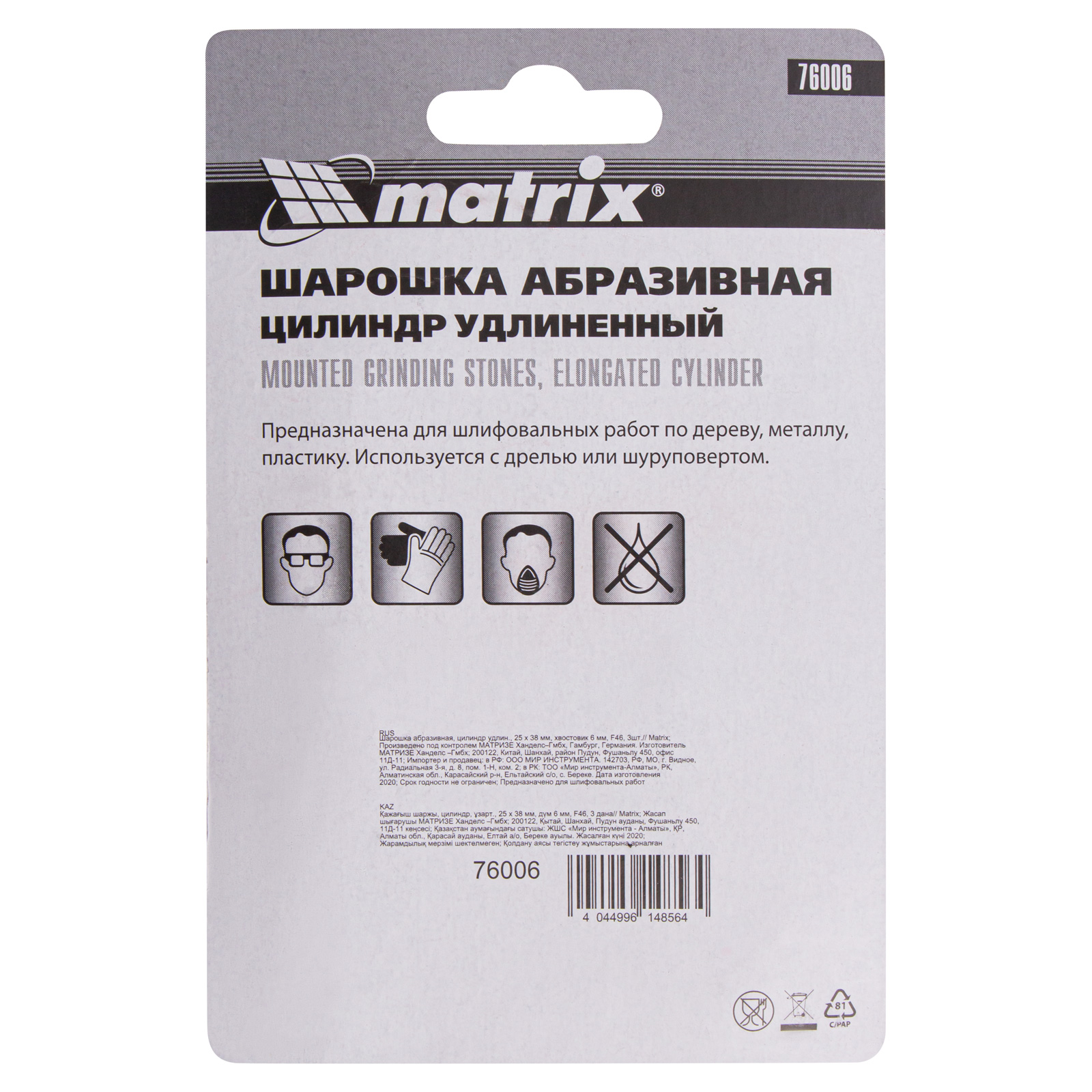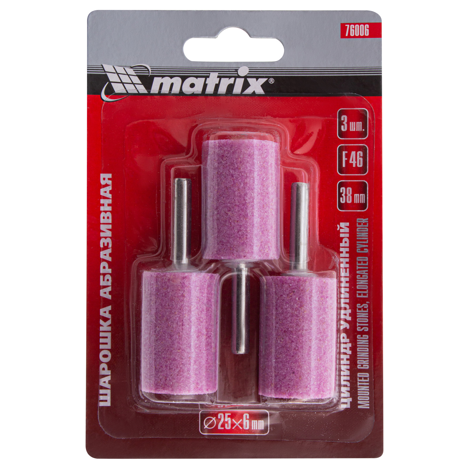 <p>Шарошка абразивная Matrix 76006, 25 х 38 мм, с хвостовиком диаметром 6 мм, 3шт., имеет форму удлиненного цилиндра и покрыта крупнозернистым абразивом F46. Предназначена для очистки прямолинейных поверхностей, расширения отверстий, снятия фасок и удаления заусенцев. Она используется в качестве оснастки на дрелях, шуруповертах, а также ПШМ при выполнении отделочных и декоративных работ.</p><h2>Преимущества</h2><ul><li>Абразив из оксида алюминия универсален по своему применению, поэтому подходит для обработки различных поверхностей: металла, пластика, древесины, минеральных материалов.</li><li>Крупнозернистый абразив F46 позволяет осуществить грубую шлифовку заготовок.</li><li>Комплект состоит из 3 шарошек, которых хватит на большой объем работ.</li></ul>