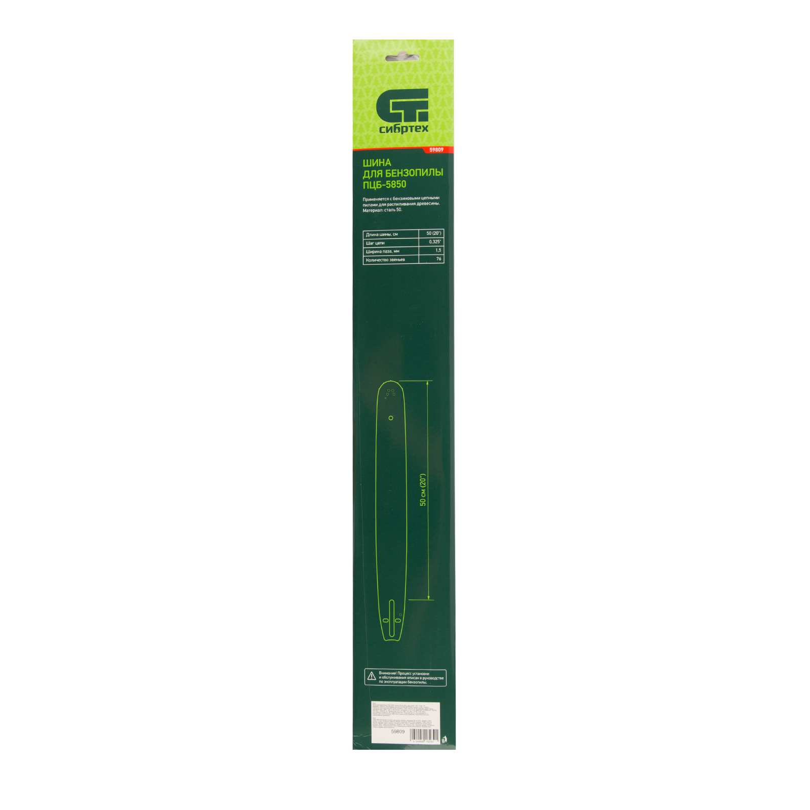 Шина Сибртех 59809 длиной 50 см (20″), с шириной паза 1,5 мм, предназначена для установки цепи с 76 звеньями и шагом 0,325″ и совместима с цепной бензиновой пилой Сибртех ПЦБ-5850. Вместе с цепью позволяет формировать аккуратные надпилы и срезы. Пила с установленной шиной может использоваться для полупрофессиональных целей: валки деревьев, частного строительства, заготовки большого количества дров, срезания толстых веток в саду.