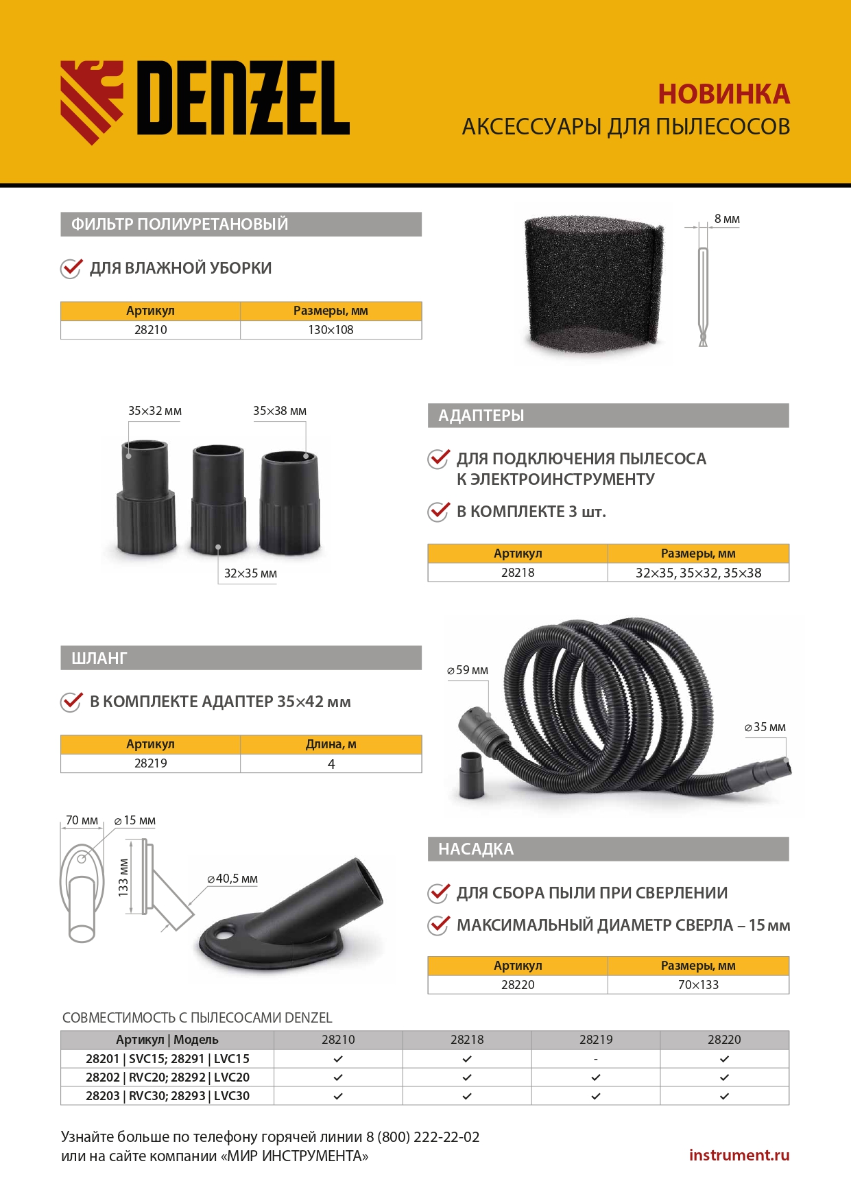 Шланг для пылесоса Denzel 28219 длиной 4 м, с адаптером 35 х 42 мм, совместим с моделями RVC20 (28202), RVC30 (28203), LVC20 (28292), LVC30 (28293). Предназначен для замены штатного шланга. Используется для присоединения насадок, а также для подключения к электроинструменту. Гибкий шланг обеспечивает комфорт во время уборки.