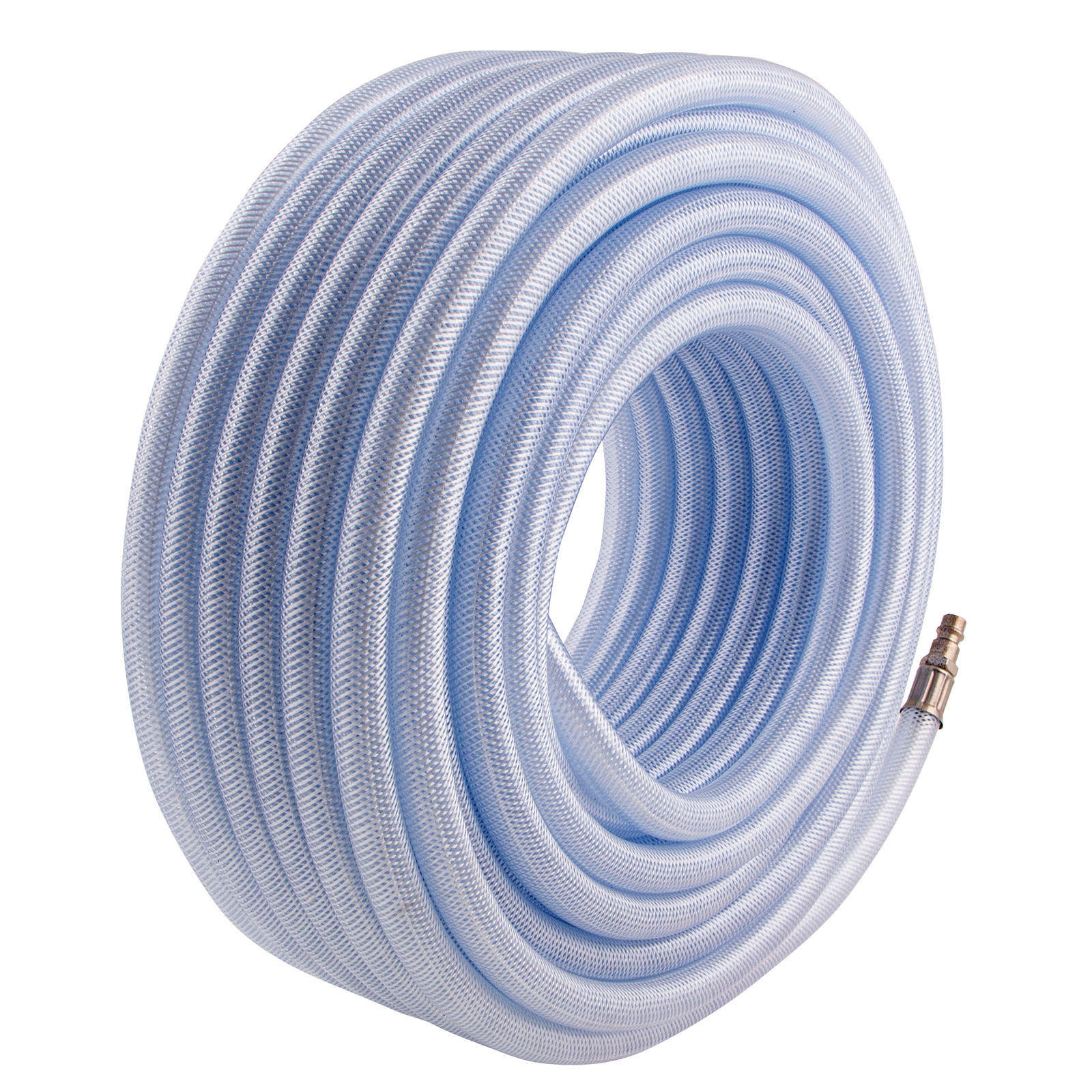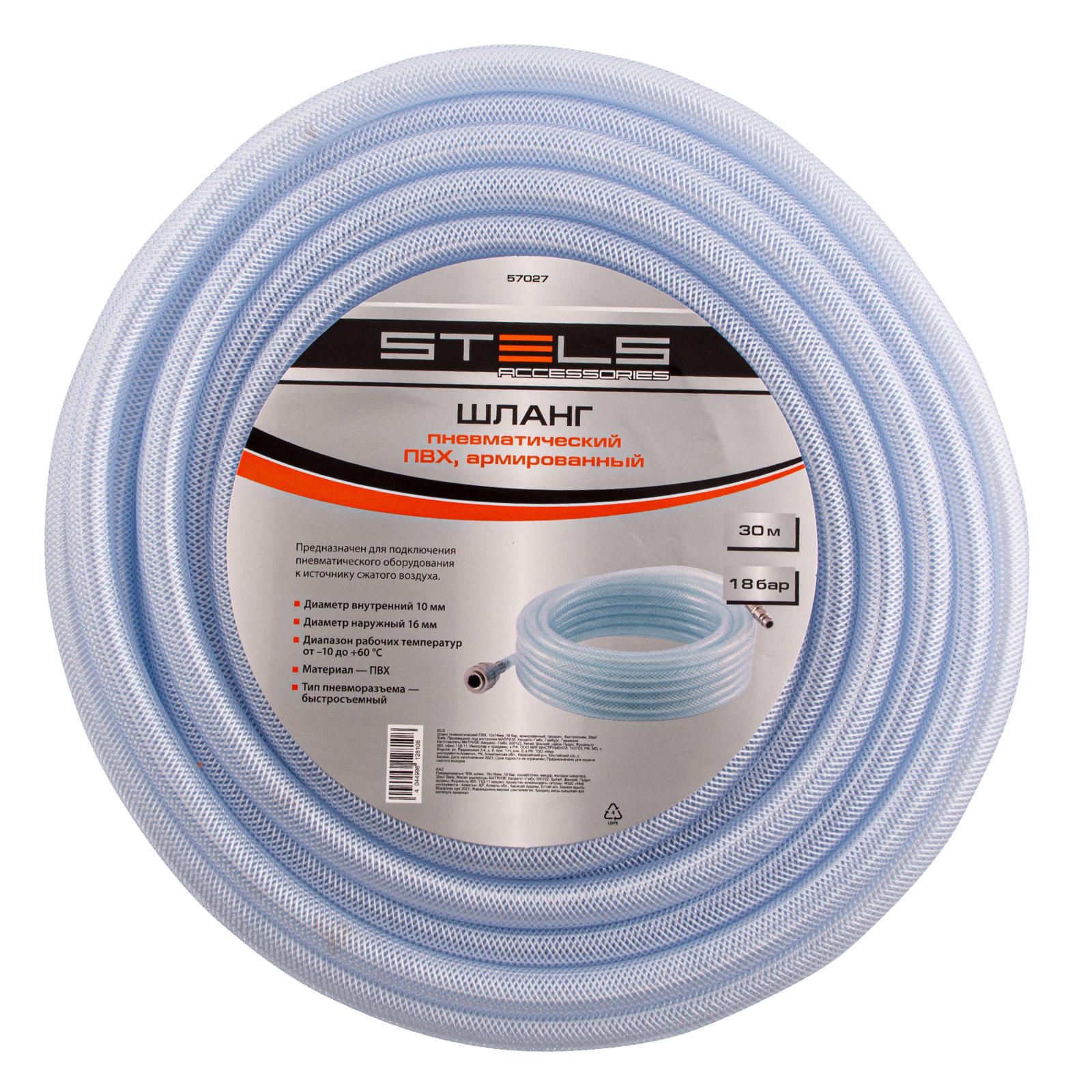 Шланг пневматический армированный прозрачный Stels 57027 из ПВХ, диаметром 10 х 16 мм и длиной 30 м, с быстросъемными соединениями, выдерживает давление до 18 бар. Предназначен для соединения между собой мощных компрессоров и инструментов с пневматическим приводом, а также прокладки магистральной пневмолинии. Шланг подойдет для использования на производственном предприятии, строительной площадке или в автосервисе.