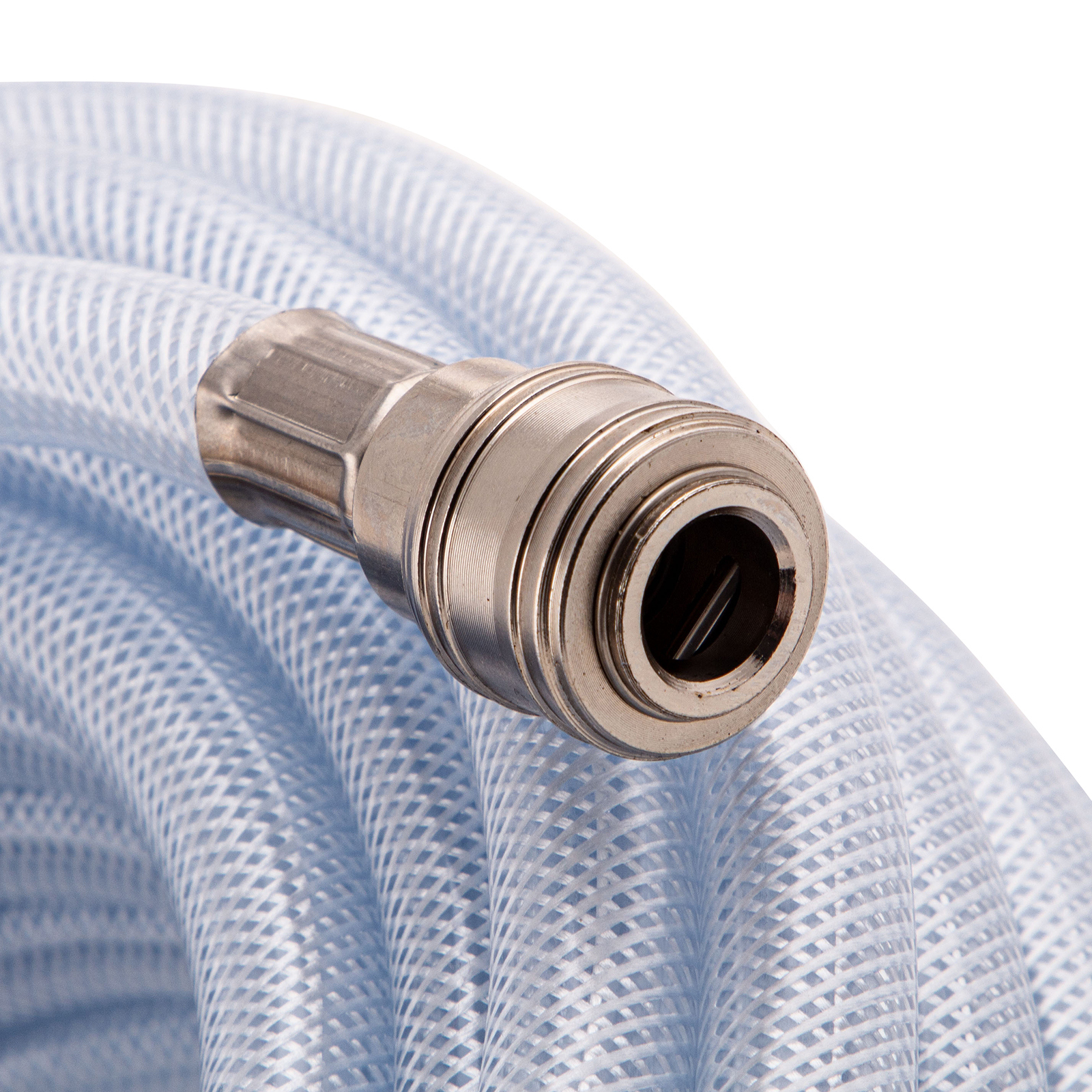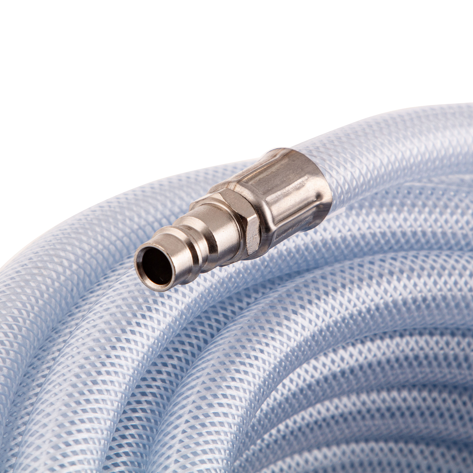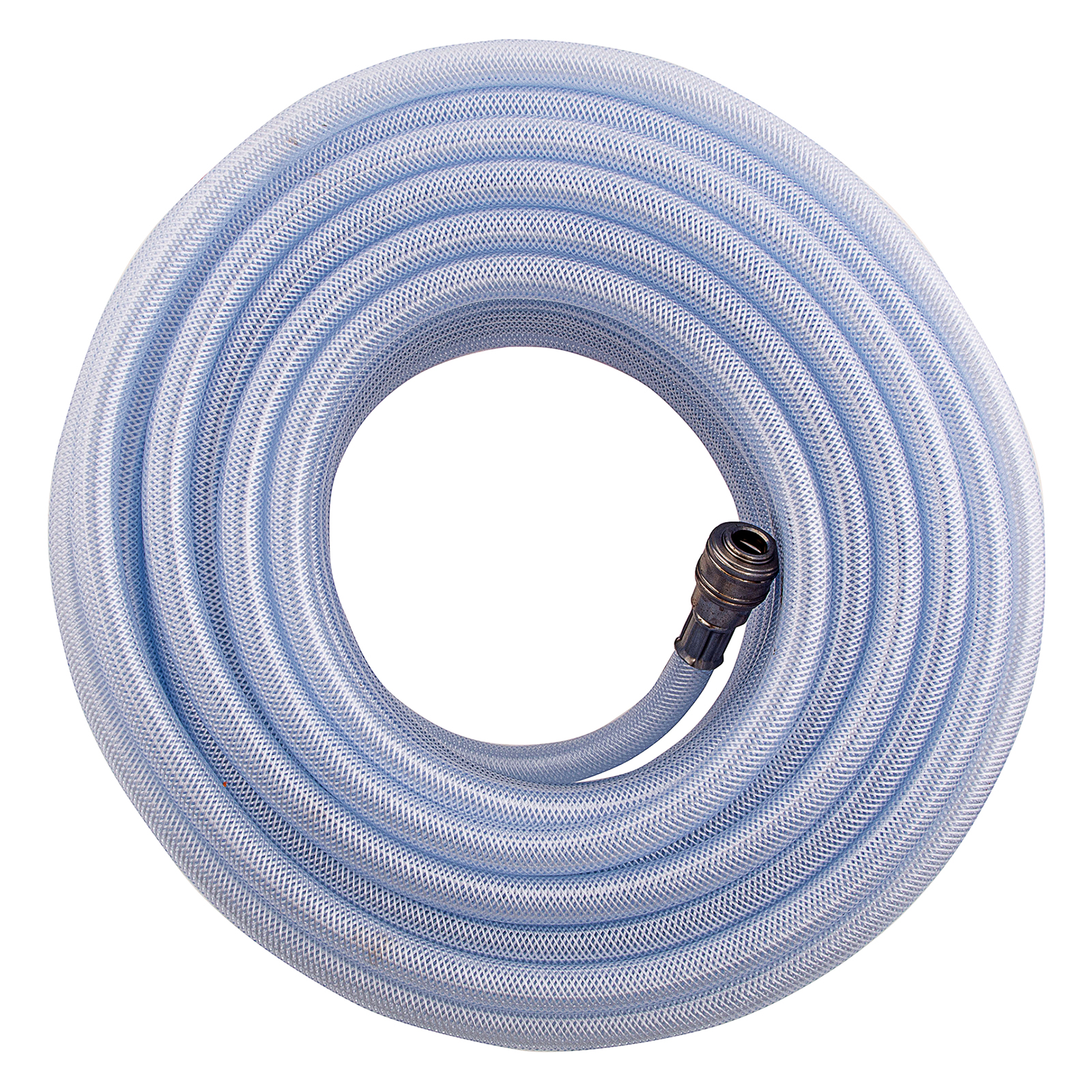- Качественное исполнение — шланг изготовлен из ПВХ и имеет армирующий слой из полиамида, поэтому характеризуется высокой прочностью и устойчивостью к падениям и пережатиям, а также невосприимчивостью к химическим воздействиям.