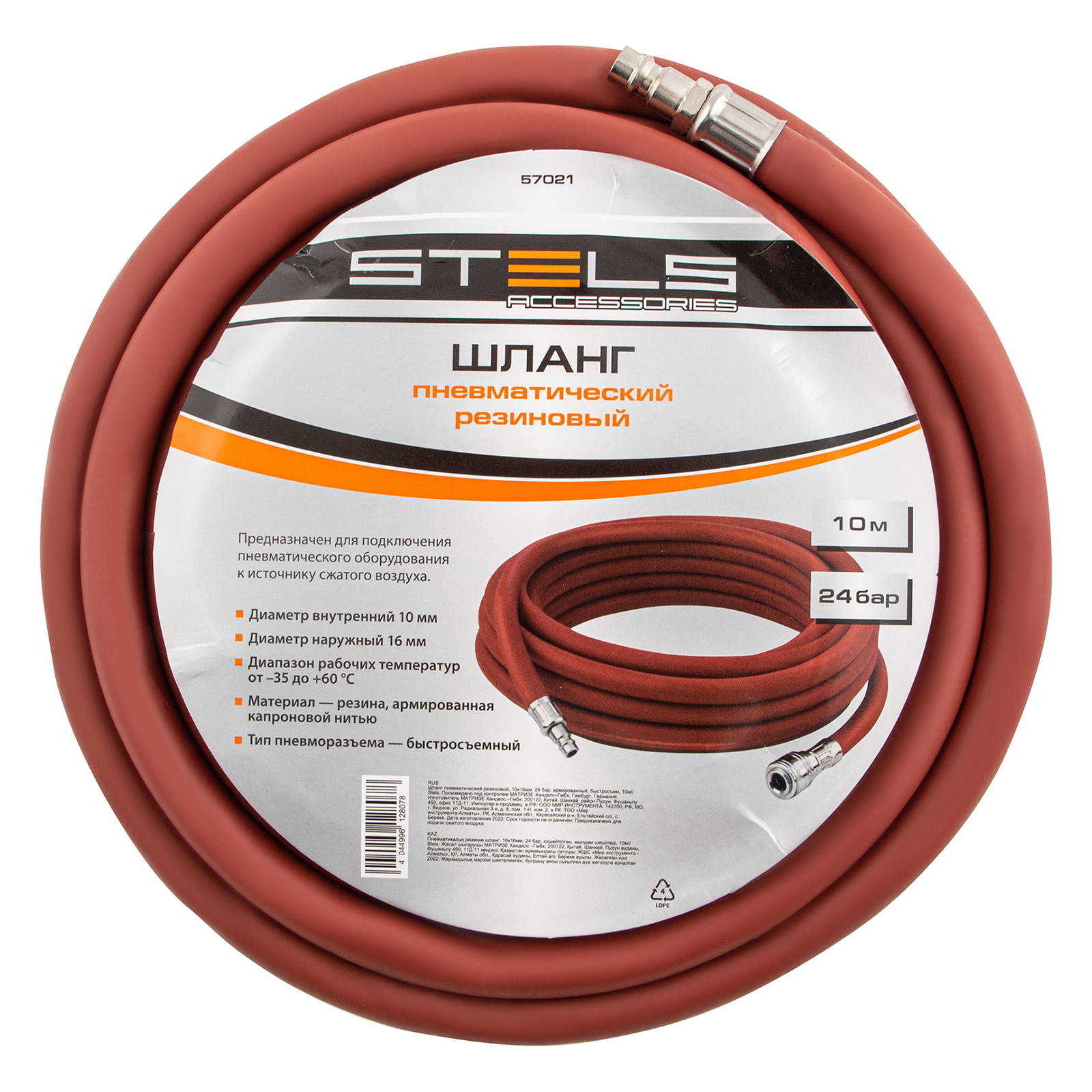 <p>Пневматический армированный резиновый шланг Stels 57021, 10 х 16 мм, длиной 10 м, с быстросъемами, служит для подключения пневматического оборудования к компрессору и выдерживает давление до 24 бар. Изготовлен из резины и армирован капроновой нитью, что обеспечивает высокую устойчивость к механическому воздействию и пережатию, а также к перепадам температур. Может использоваться для прокладки воздушной магистрали. Шланг пригодится на производстве, строительной площадке и в автосервисе.</p><h2>Преимущества</h2><ul><li>Быстросъемные соединения типа рапид облегчают подключение шланга к компрессору и пневматическим инструментам.</li><li>Антикоррозийное никелевое покрытие защищает штуцер и муфту от ржавчины, что увеличивает срок их службы.</li><li>Длина 10 м обеспечивает мастеру свободное перемещение во время работы.</li><li>Увеличенная толщина шланга придает ему повышенную прочность.</li></ul>