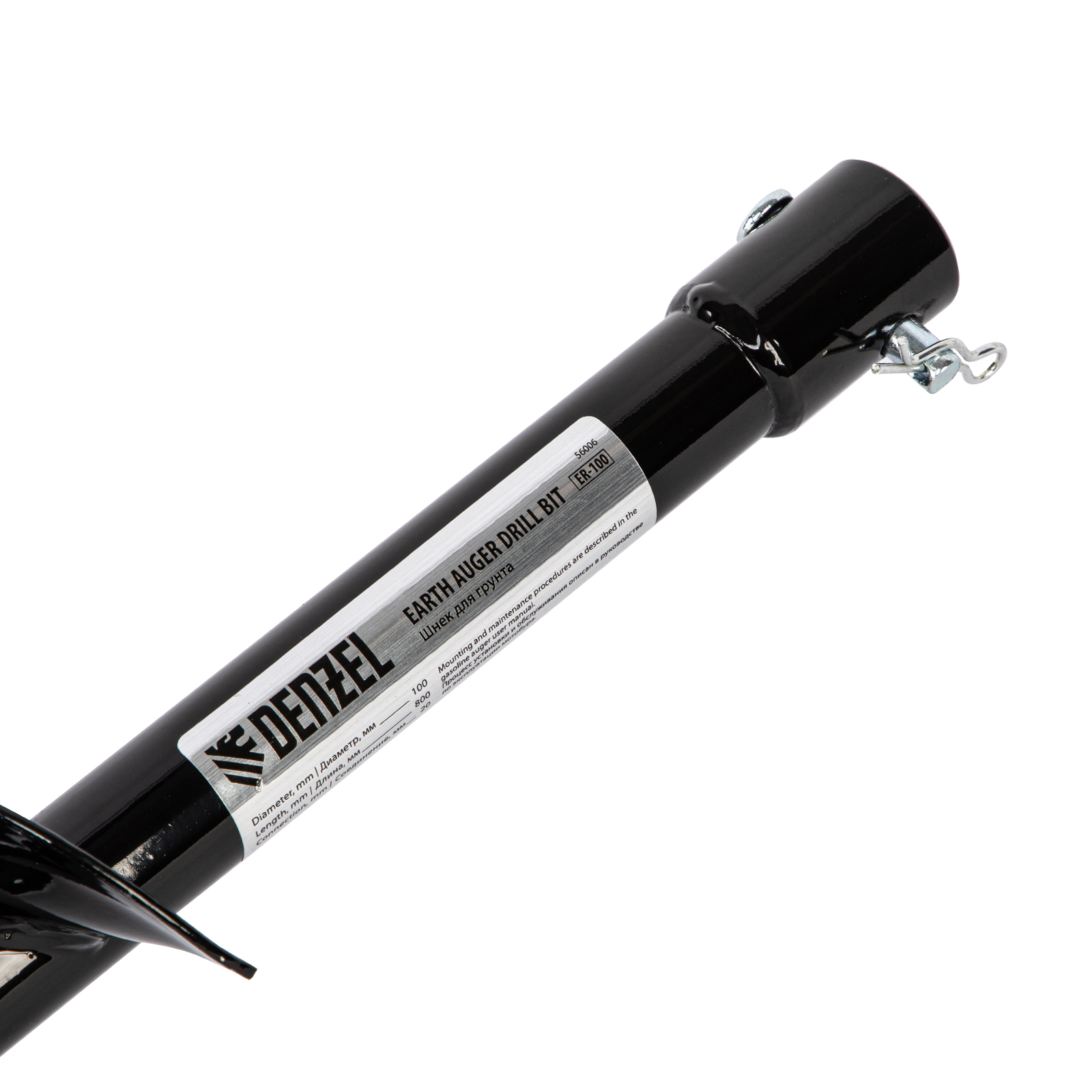 Шнек для грунта Denzel ER-100 56006 длиной 800 мм с диаметром соединения 20 мм, со съемным ножом, устанавливается на мотобур и используется для бурения отверстий диаметром 100 мм. Инструмент пригодится для установки столбчатых опор, формирования лунок для посадки растений и бурения отверстий в грунте различной плотности при выполнении других задач.