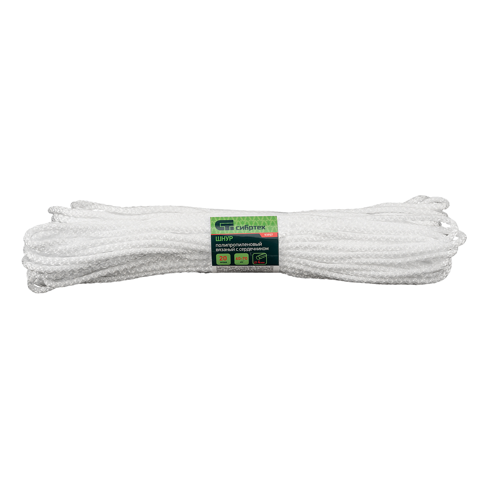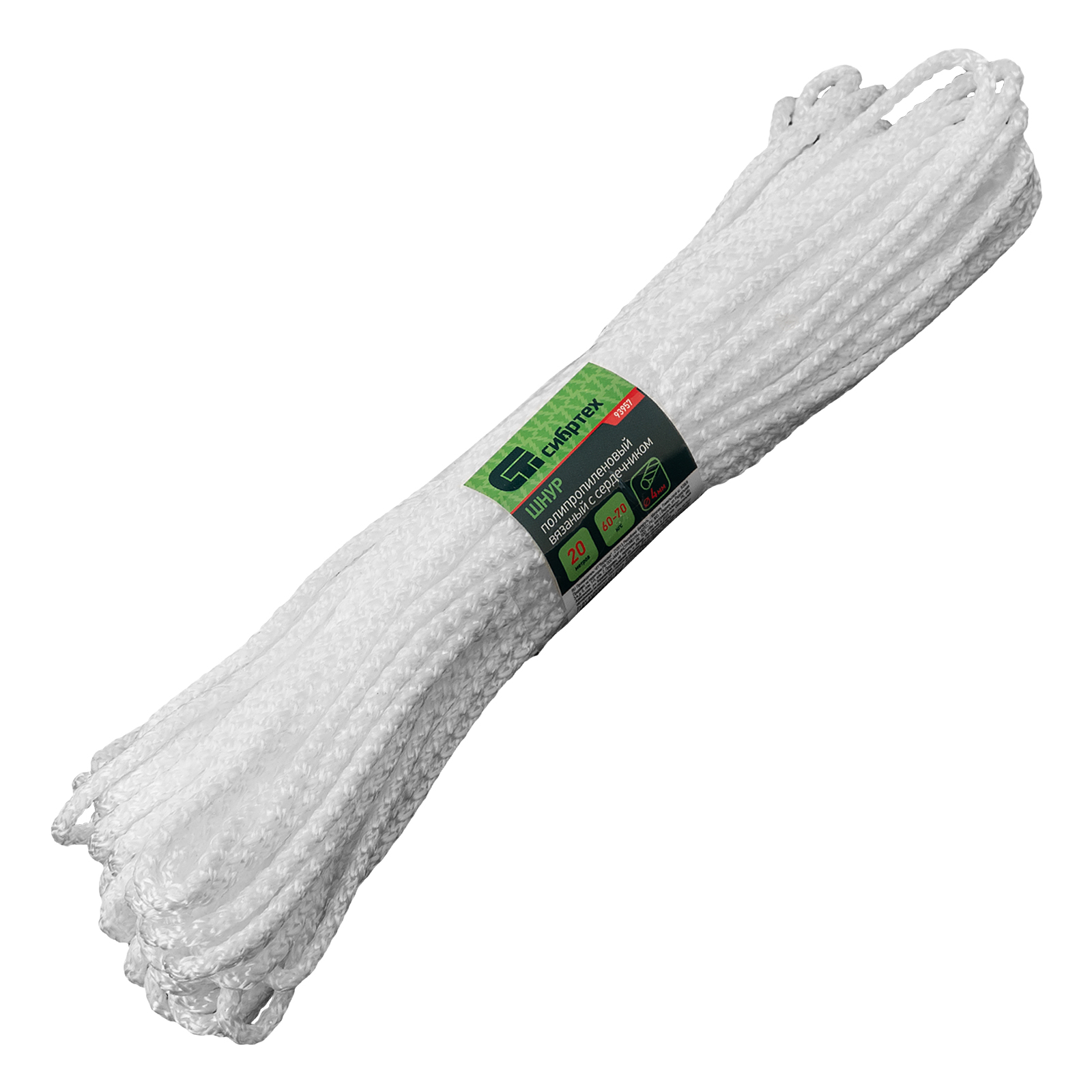 Вязаный полипропиленовый шнур с сердечником Сибртех 93957 белого цвета, диаметром 4 мм, длиной 20 м, будет полезен для хозяйственных нужд: сушки белья, связывания предметов, подвязки растений. Пригодится также в походе, на охоте или рыбалке. Благодаря сердечнику и высокопрочной оплетке обладает повышенной устойчивостью к истиранию и разрыву — максимальная разрывная нагрузка составляет 60 кгс. Шнур выдерживает значительный вес, не растягивается и не провисает.