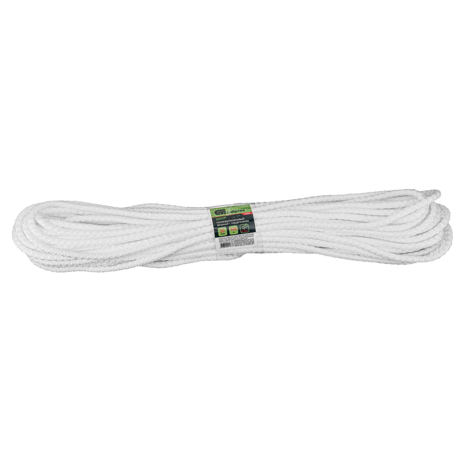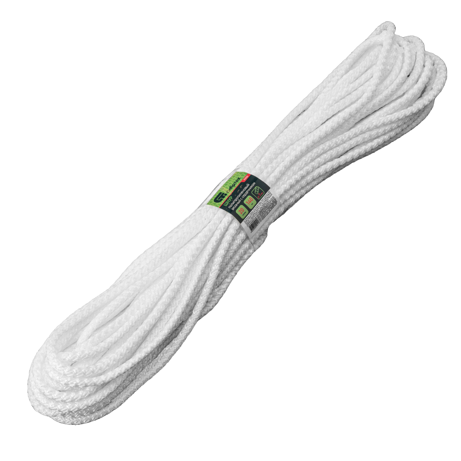 Вязаный полипропиленовый шнур с сердечником Сибртех 93960 белого цвета, диаметром 7 мм, длиной 20 м, будет полезен для хозяйственных нужд: сушки белья, связывания предметов, подвязки растений. Пригодится также в походе, на охоте или рыбалке. Благодаря сердечнику и высокопрочной оплетке обладает повышенной устойчивостью к истиранию и разрыву — максимальная разрывная нагрузка составляет 140 кгс. Шнур выдерживает значительный вес, не растягивается и не провисает.