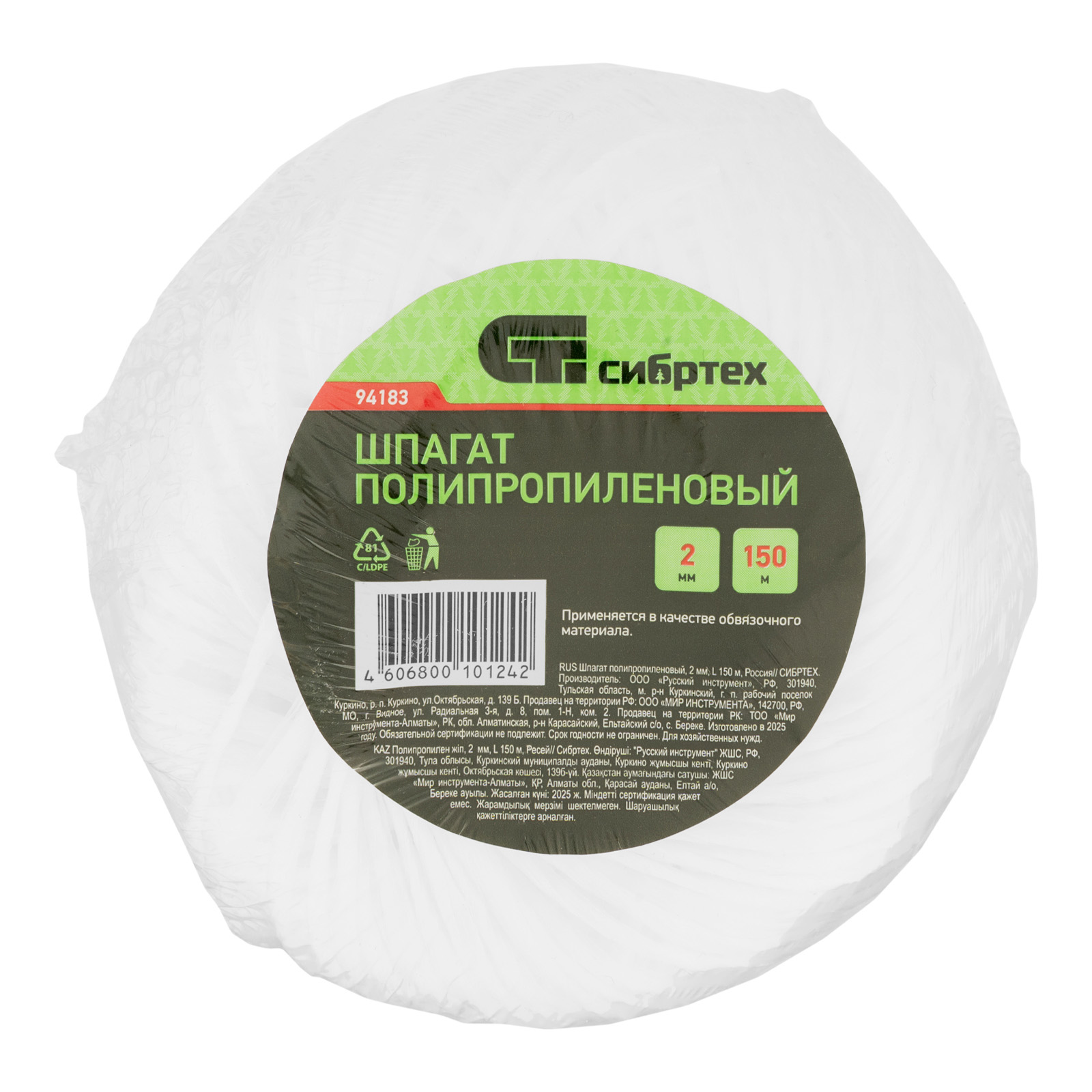 Полипропиленовый шпагат Сибртех 94183 длиной 150 м и толщиной 2 мм применяется для обвязывания упаковки. Пригодится в цехе, на складе, в гараже, будет полезен в быту. Полипропилен устойчив к разрыву и механическим нагрузкам, выдерживает многократные изгибы без риска повреждения.