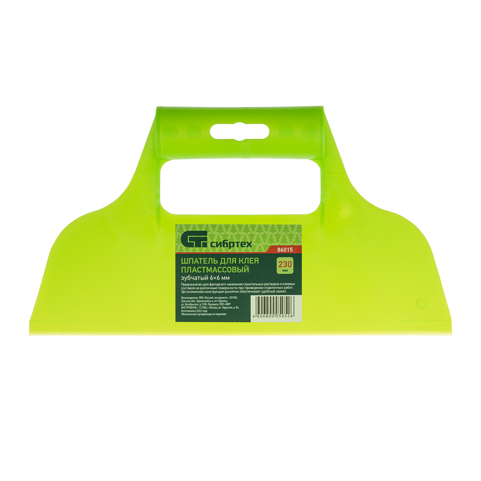 Пластмассовый шпатель для клея Сибртех 86015, зубчатый (квадратные зубья 6 х 6 мм), рассчитан на нанесение клеевых составов и их последующее выравнивание. Зубчатая рабочая часть позволяет равномерно наносить смесь для надежного соединения с плиткой и расходовать ее экономно.
