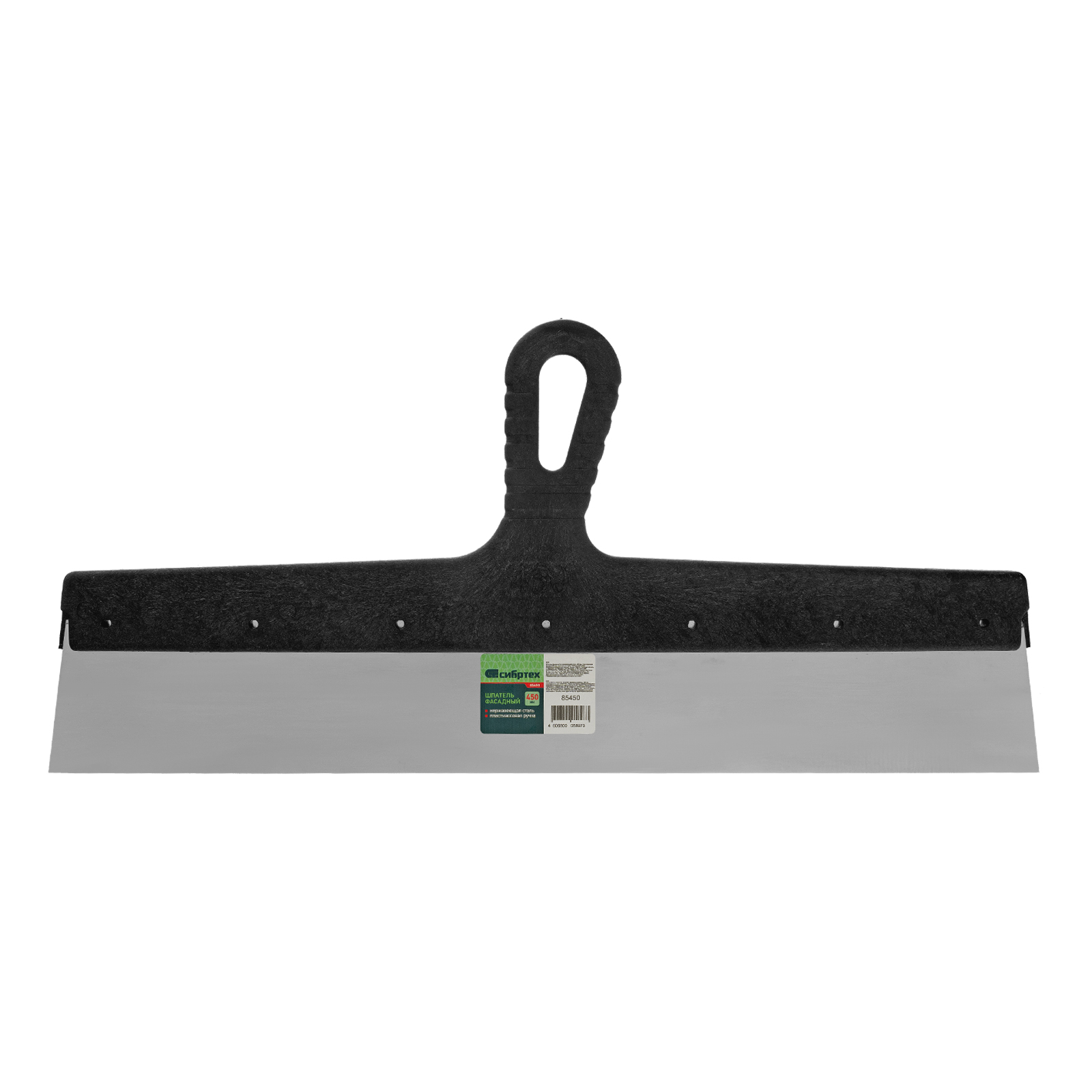 Шпатель фасадный Сибртех 85450 с полотном шириной 450 мм из нержавеющей стали и пластмассовой ручкой рассчитана на нанесение, выравнивание и сглаживание строительных растворов и смесей. Актуальна при проведении ремонтно-отделочных работ, подходит для начинающих и профессиональных мастеров.