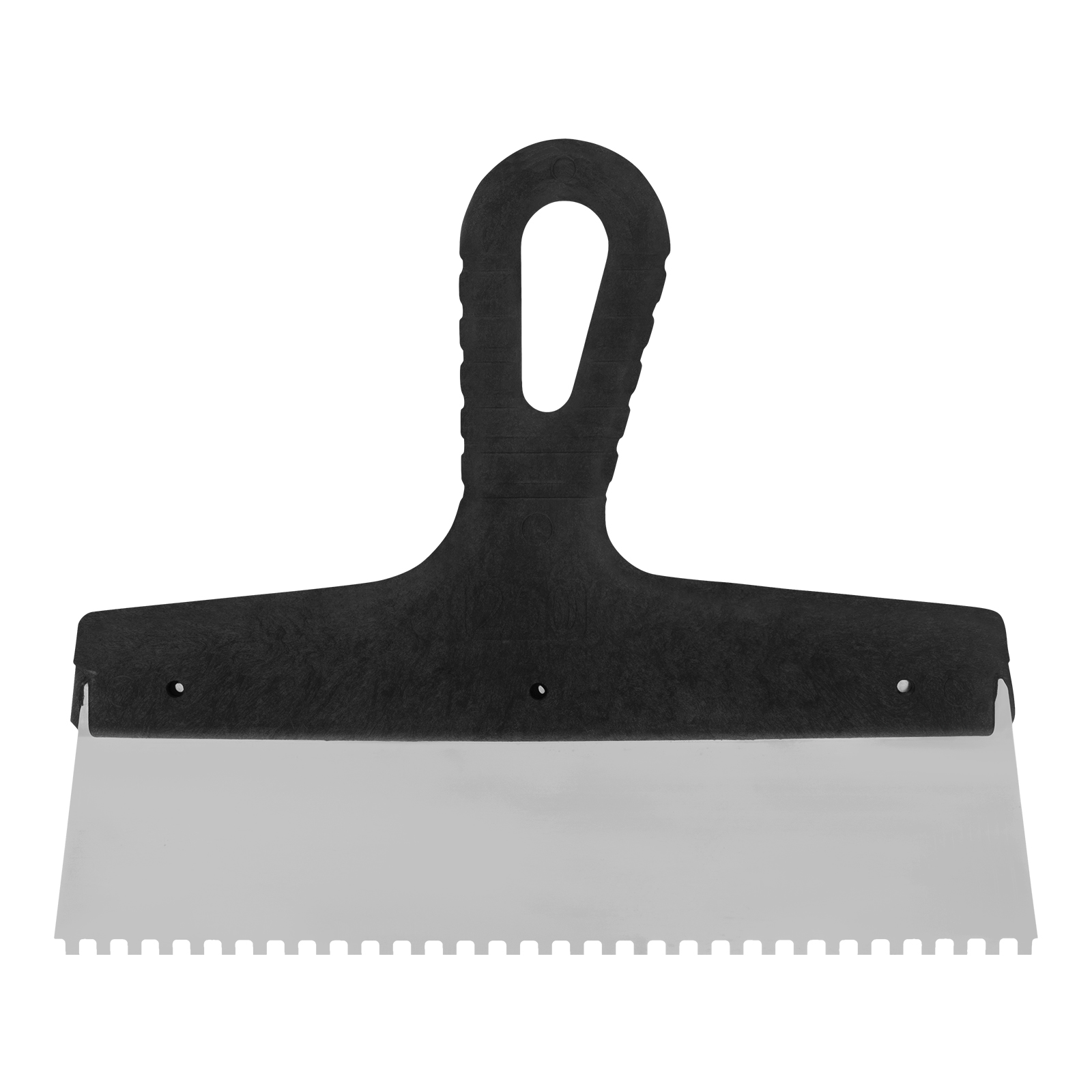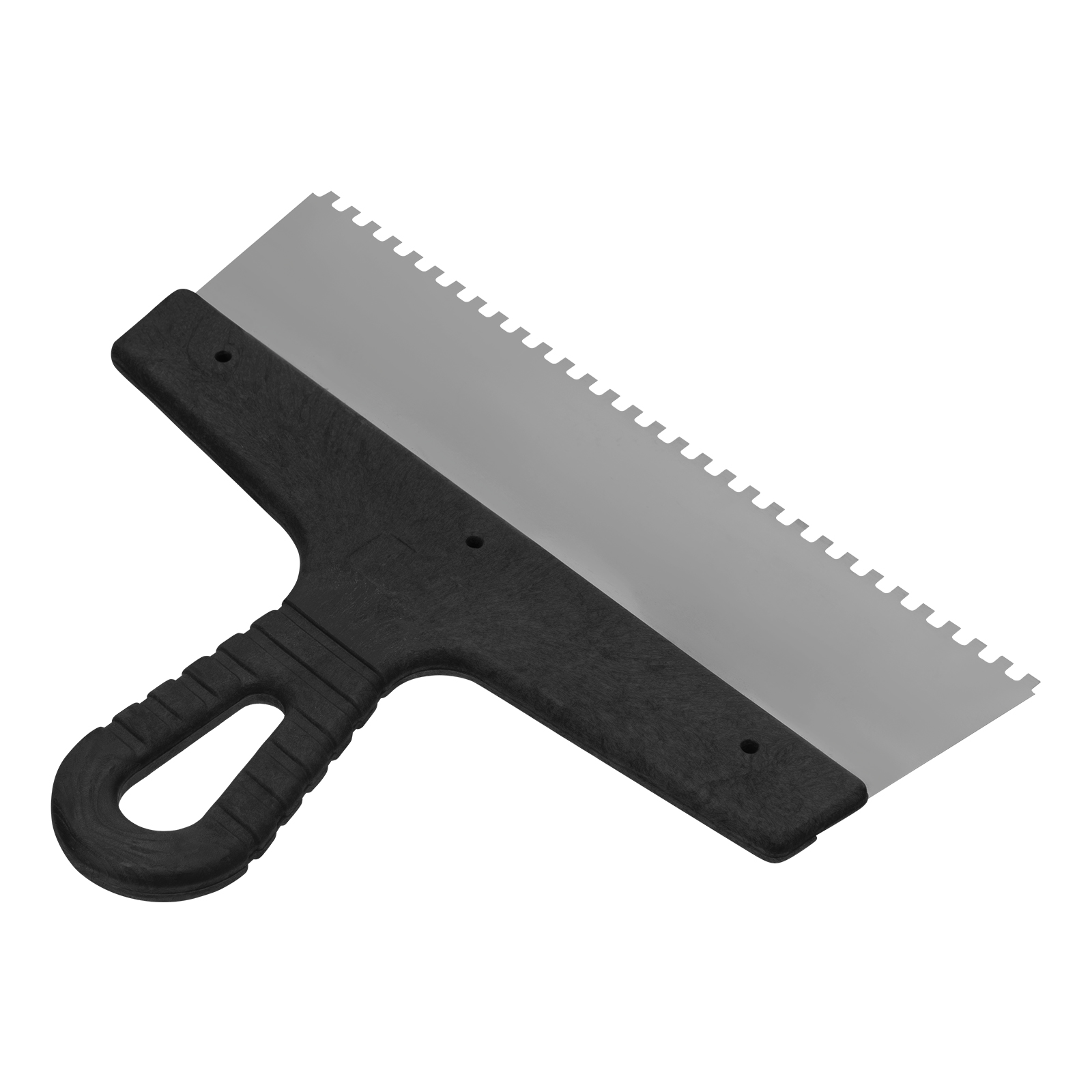 Шпатель Сибртех 85457 из нержавеющей стали, шириной 250 мм, с пластмассовой рукояткой и зубьями 4 х 4 мм, применяется во время проведения работ по укладке плитки, мозаики и т. д. Квадратные зубья облегчают нанесение клеевого состава, позволяя равномерно распределять его по поверхности. Зубья размером 4 х 4 мм рассчитаны на плитку площадью 50-100 см2.