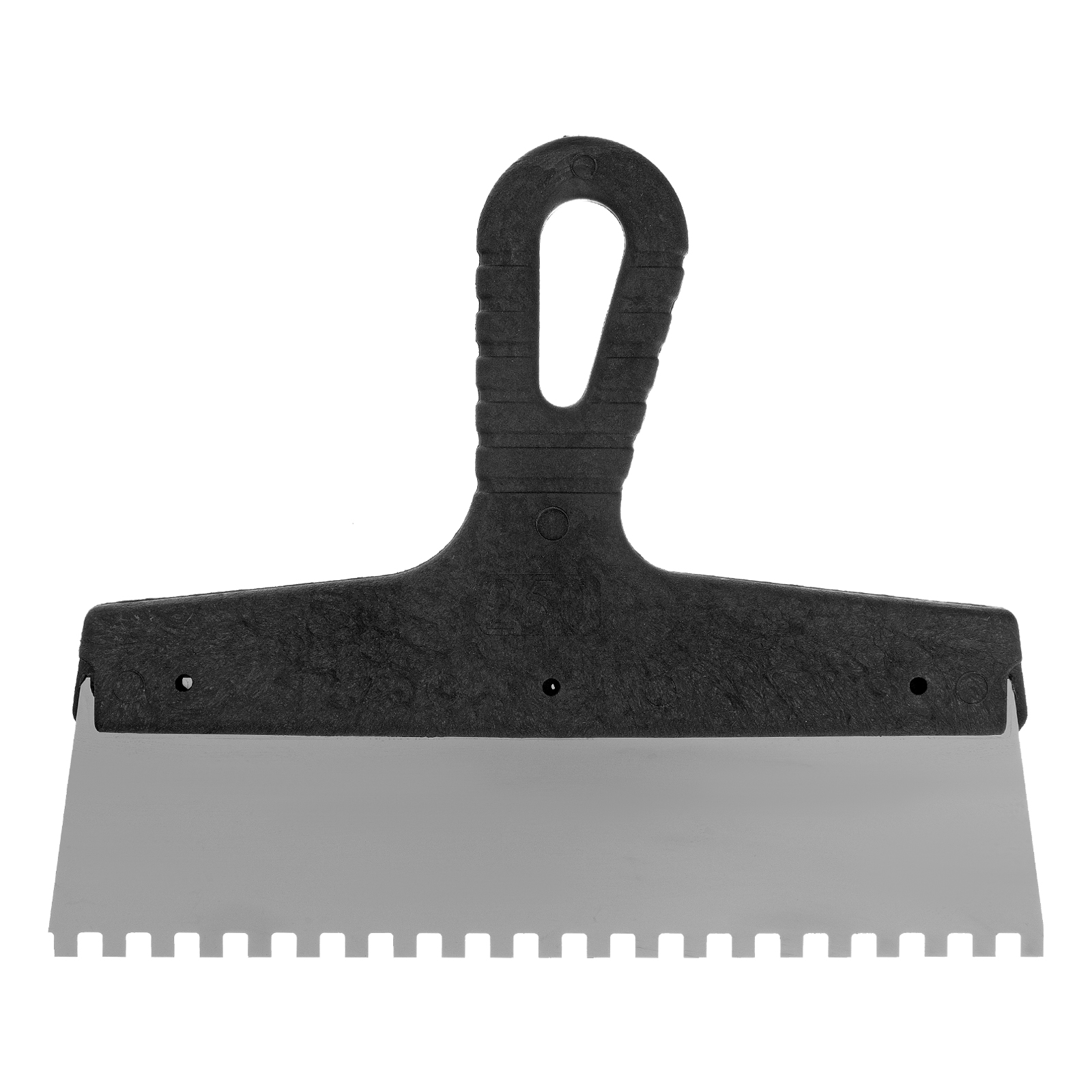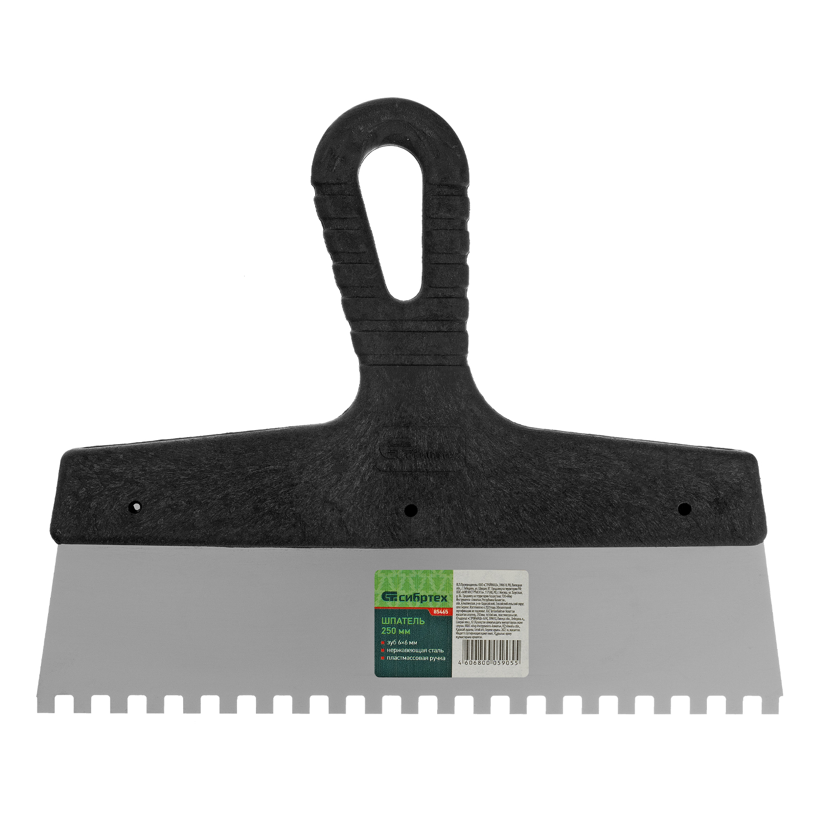 Шпатель Сибртех 85465 из нержавеющей стали, шириной 250 мм, с пластмассовой рукояткой и зубьями 6 х 6 мм, применяется во время проведения работ по укладке плитки, мозаики и т. д. Квадратные зубья облегчают нанесение клеевого состава, позволяя равномерно распределять его по поверхности. Зубья размером 6 х 6 мм рассчитаны на плитку площадью 100-400 см2.