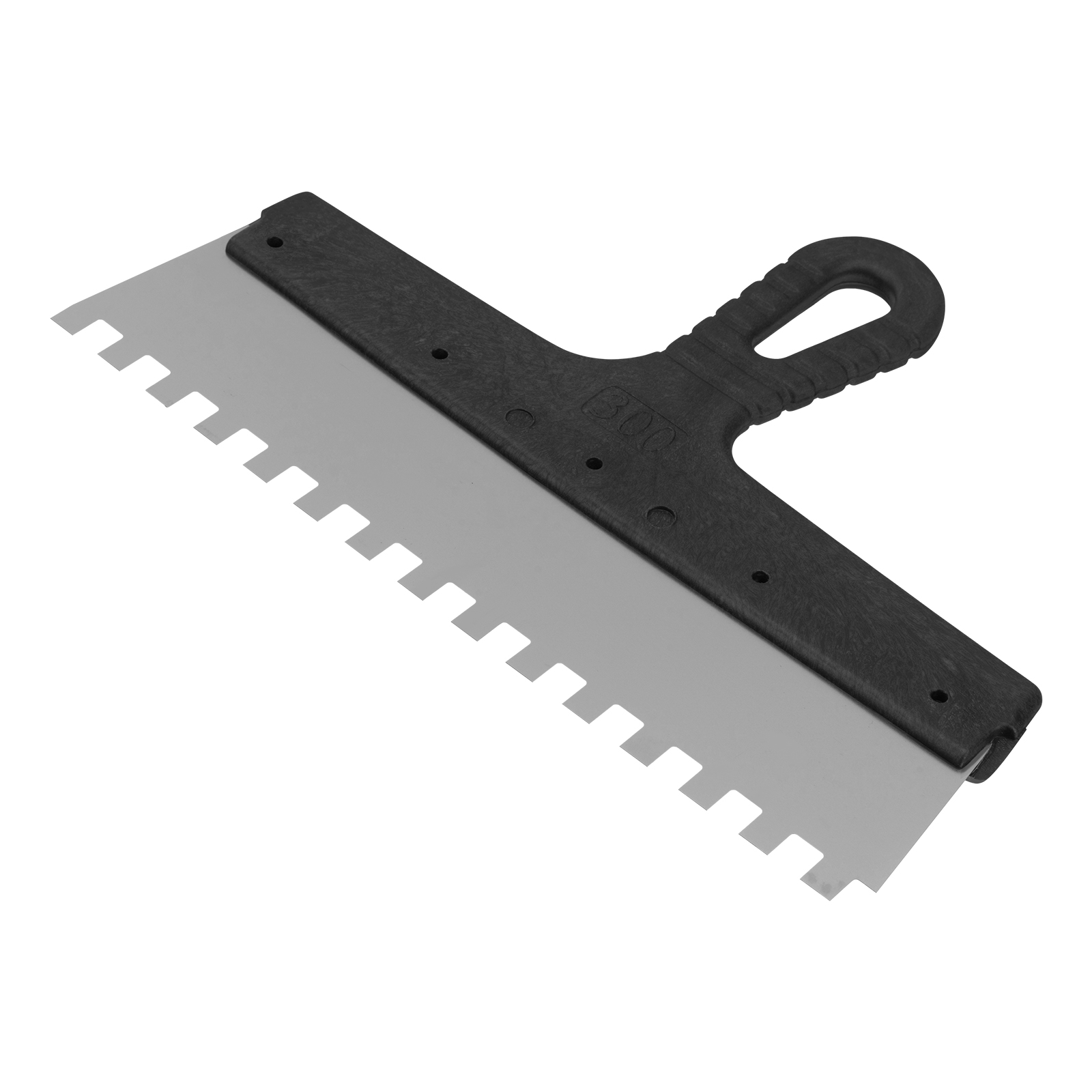 Шпатель Сибртех 85501 из нержавеющей стали, шириной 300 мм, с пластмассовой рукояткой и зубьями 10 х 10 мм, применяется во время проведения работ по укладке плитки, мозаики и т. д. Квадратные зубья облегчают нанесение клеевого состава, позволяя равномерно распределять его по поверхности. Зубья размером 10 х 10 мм рассчитаны на плитку площадью 900-2500 см2.