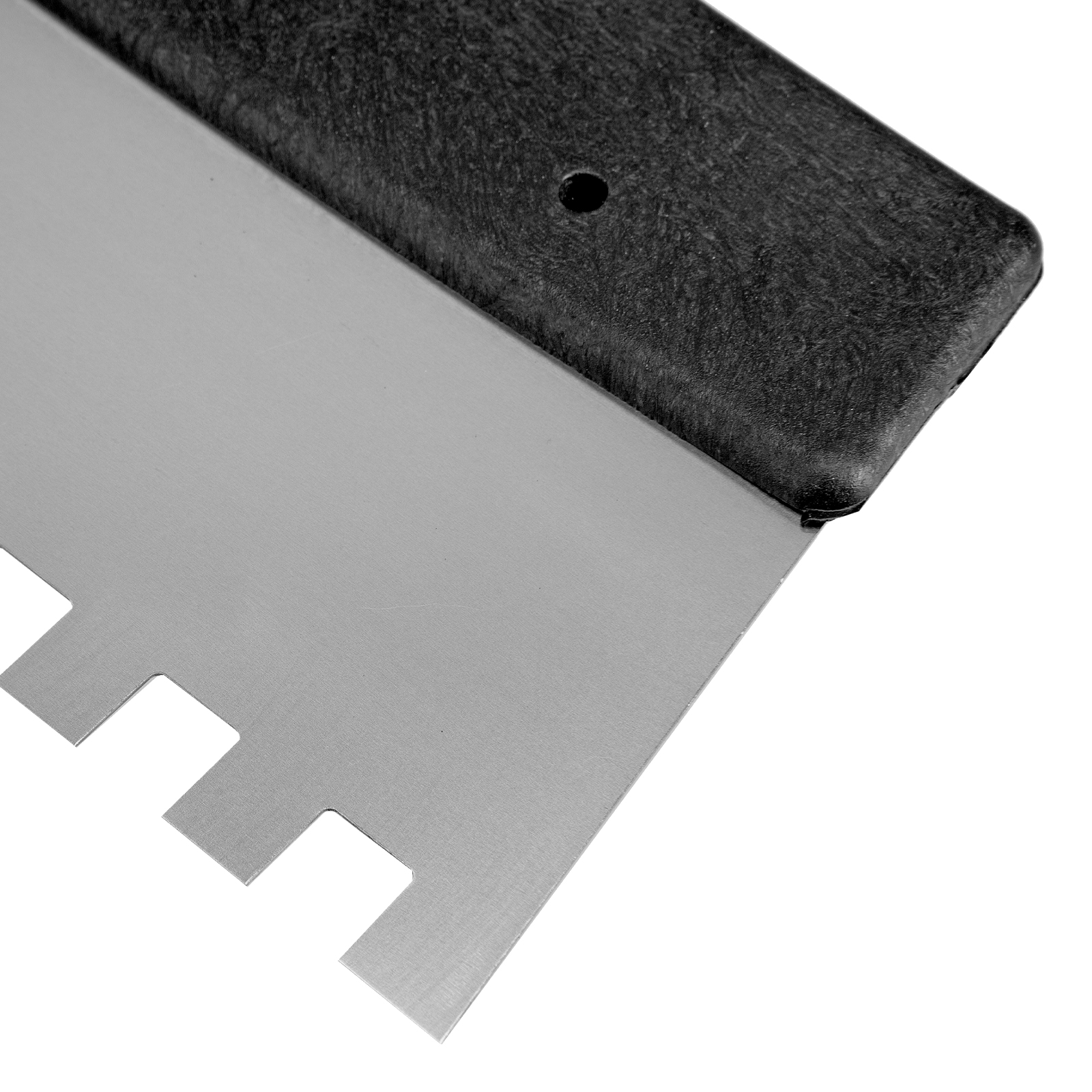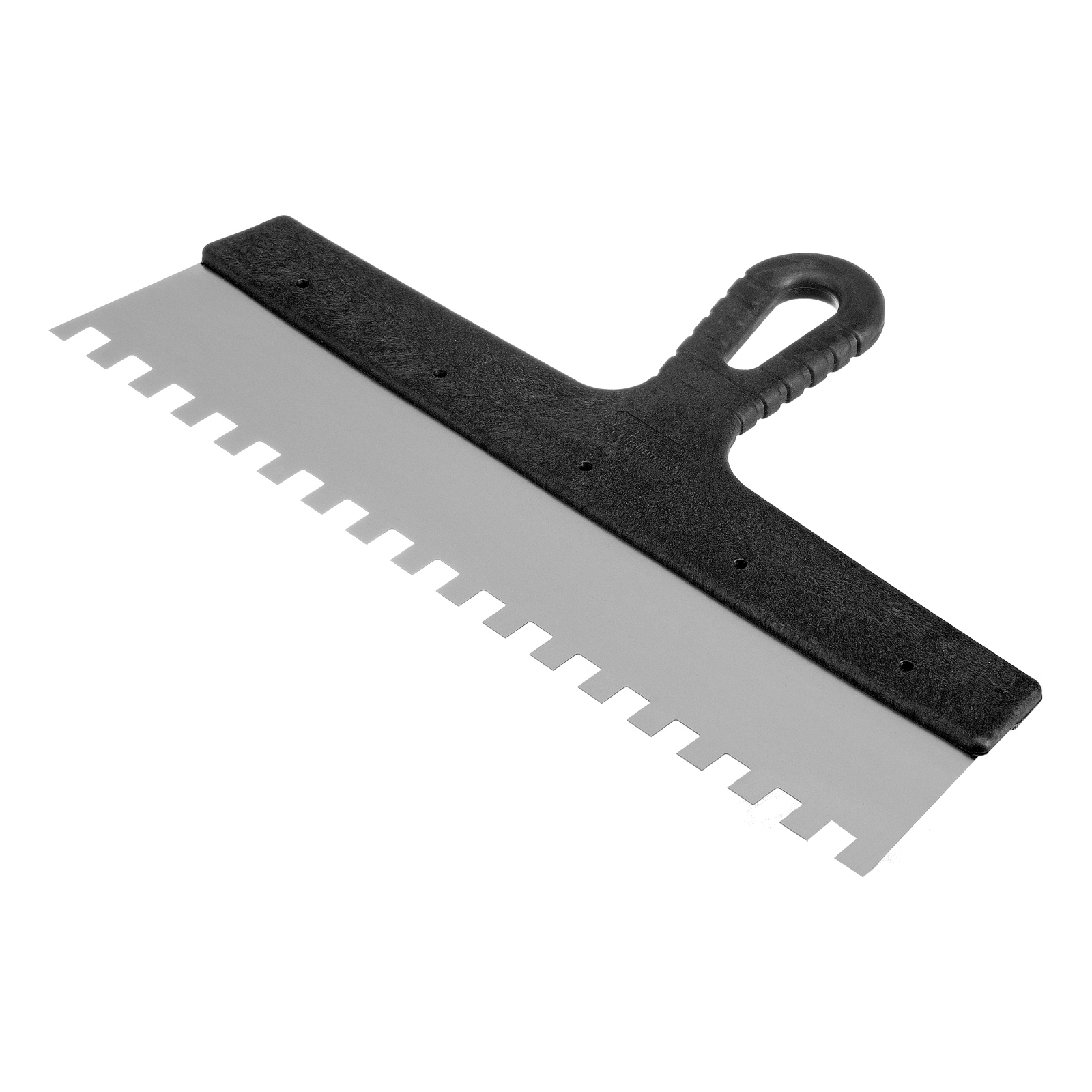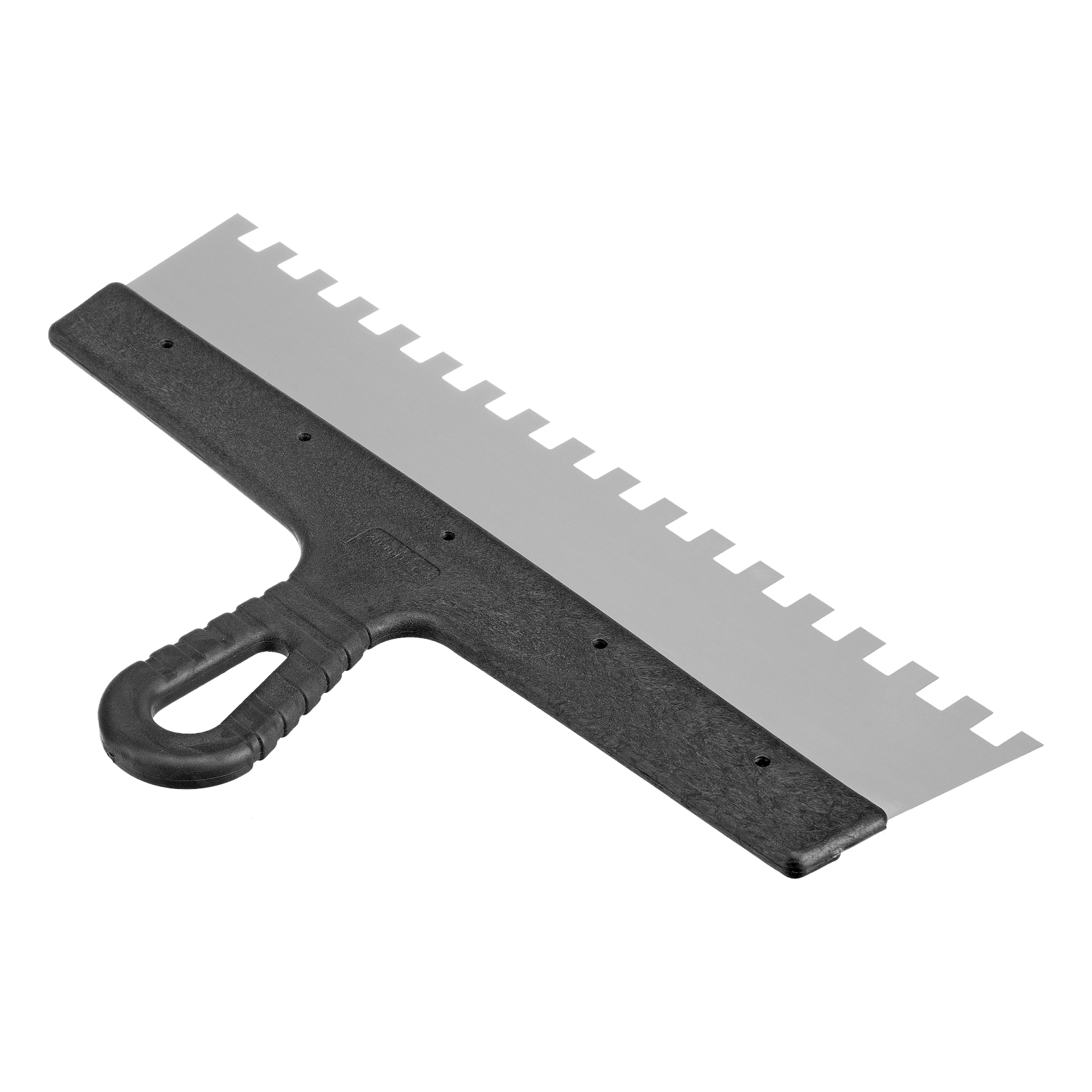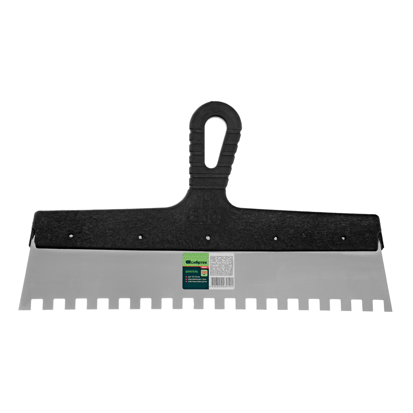 Шпатель Сибртех 85507 из нержавеющей стали, шириной 350 мм, с пластмассовой рукояткой и зубьями 10 х 10 мм, применяется во время проведения работ по укладке плитки, мозаики и т. д. Квадратные зубья облегчают нанесение клеевого состава, позволяя равномерно распределять его по поверхности. Зубья размером 10 х 10 мм рассчитаны на плитку площадью 900-2500 см2.