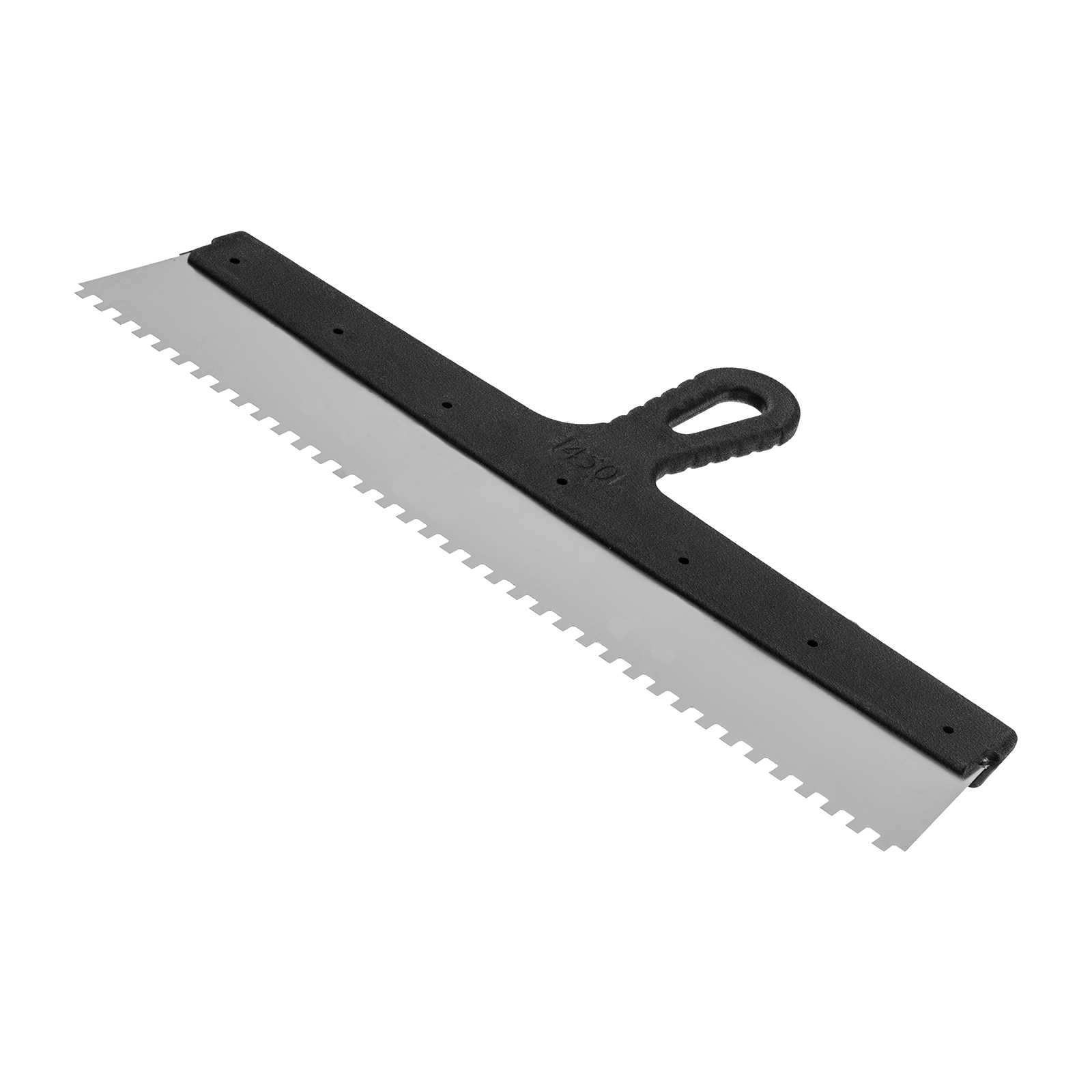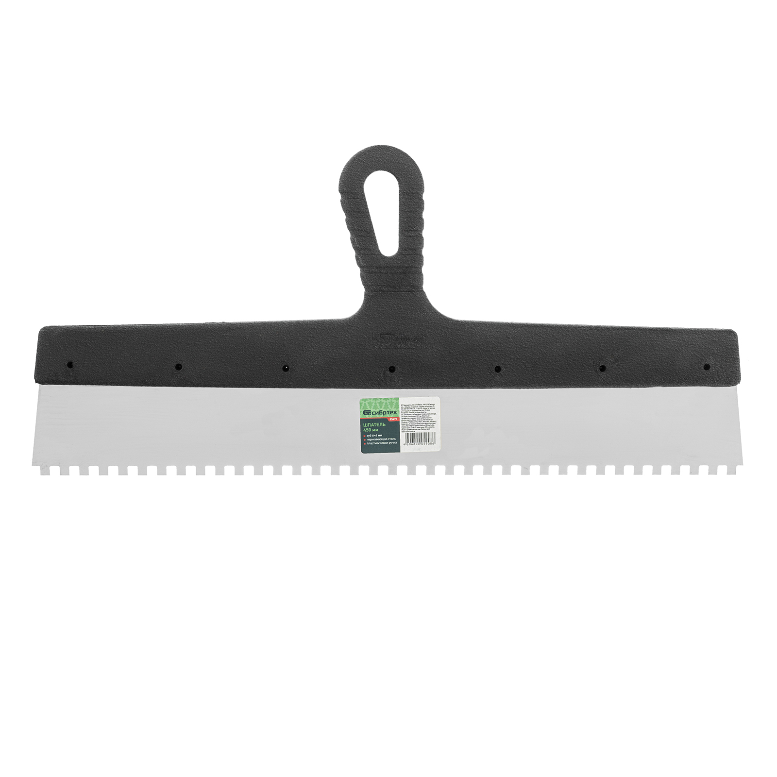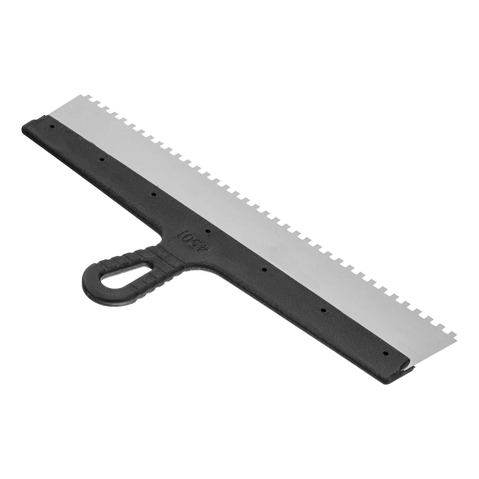 Шпатель Сибртех 85470 из нержавеющей стали, шириной 450 мм, с пластмассовой рукояткой и зубьями 6 х 6 мм, применяется во время проведения работ по укладке плитки, мозаики и т. д. Квадратные зубья облегчают нанесение клеевого состава, позволяя равномерно распределять его по поверхности. Зубья размером 6 х 6 мм рассчитаны на плитку площадью 100-400 см2.