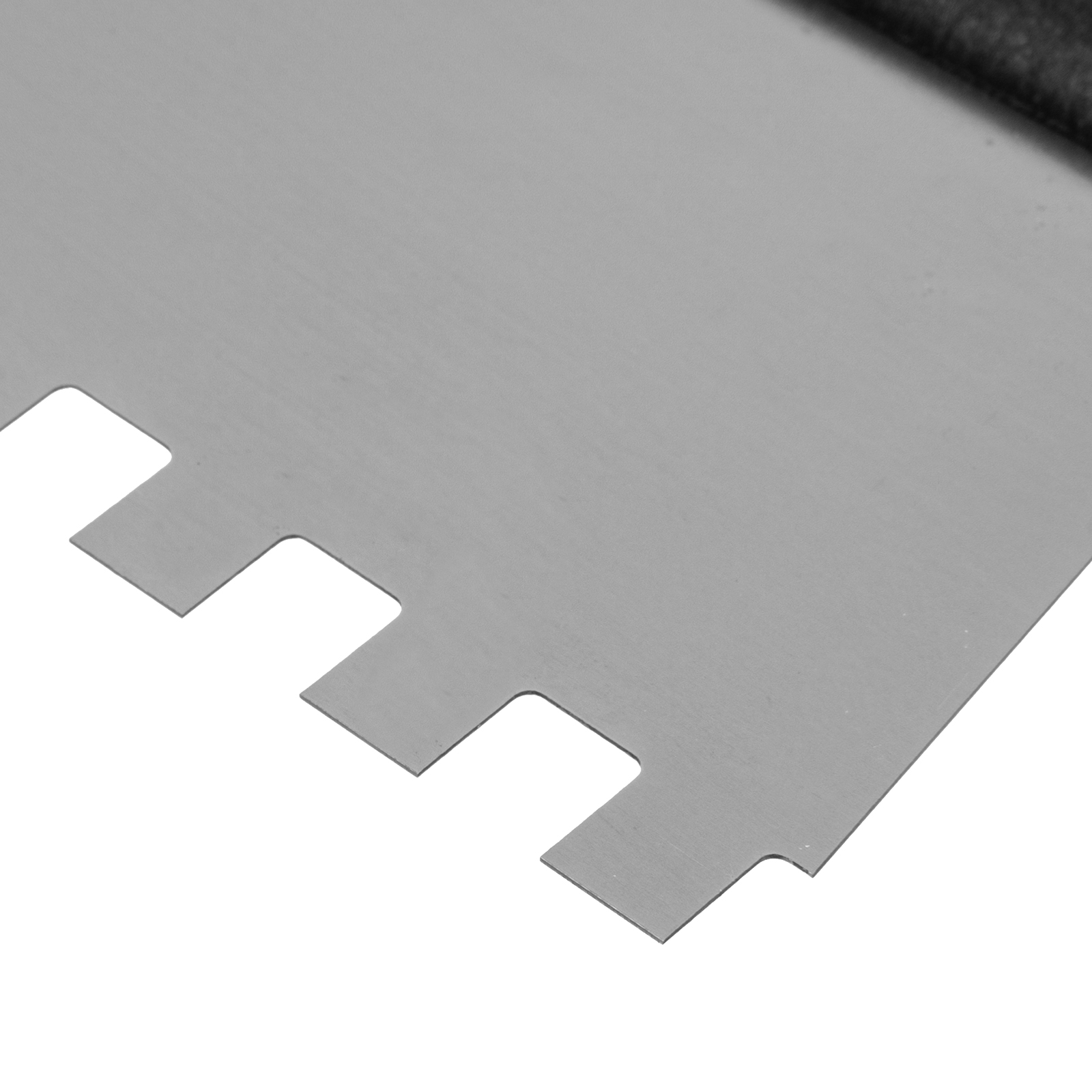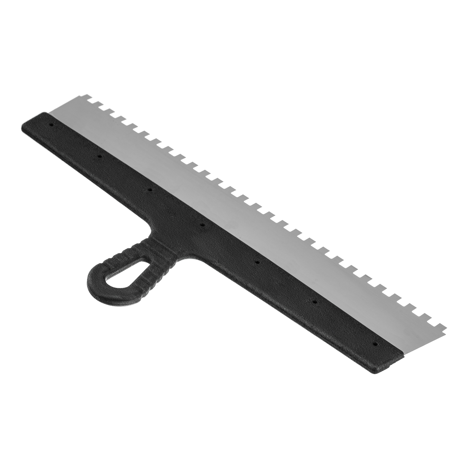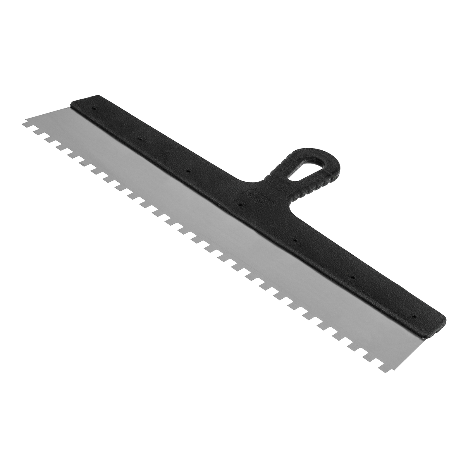 Шпатель Сибртех 85479 из нержавеющей стали, шириной 450 мм, с пластмассовой рукояткой и зубьями 8 х 8 мм, применяется во время проведения работ по укладке плитки, мозаики и т. д. Квадратные зубья облегчают нанесение клеевого состава, позволяя равномерно распределять его по поверхности. Зубья размером 8 х 8 мм рассчитаны на плитку площадью 400-900 см2.