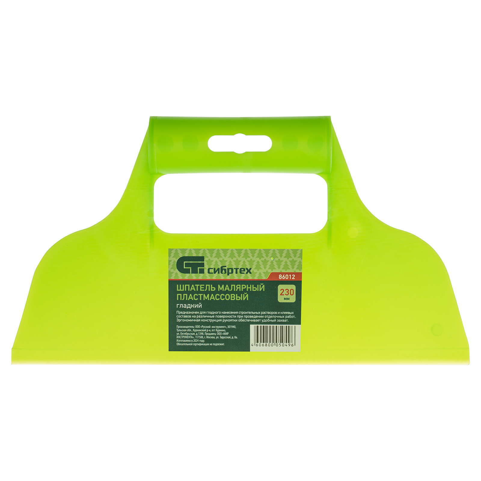 Пластмассовый малярный шпатель Сибртех 86012 с гладкой поверхностью пригодится для проведения отделочно-ремонтных работ. Позволяет равномерно наносить штукатурку, клей и другие строительные растворы.