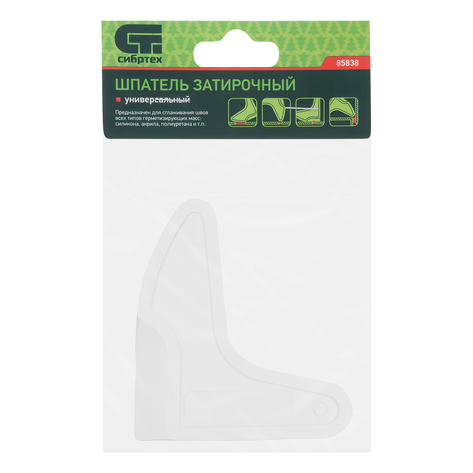 Универсальный затирочный шпатель Сибртех 85838 предназначен для сглаживания швов. Используется при проведении отделочных работ с силиконовыми, акриловыми, полиуретановыми и другими герметизирующими материалами. Шпатель не царапает поверхность и подходит для работы с облицовочными материалами.