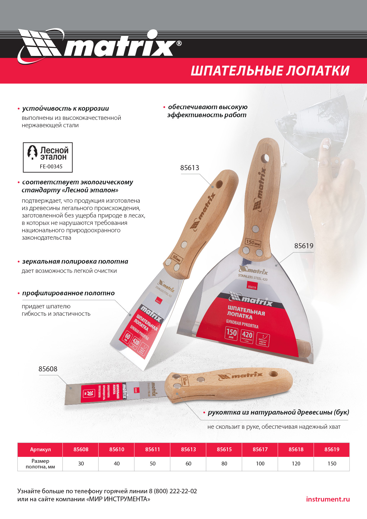 - Экологичность — наличие сертификата «Лесной эталон» подтверждает, что для изготовления инструмента использована древесина легального происхождения, заготовленная без ущерба природе, из лесов, в которых не нарушаются требования национального природоохранного законодательства.
