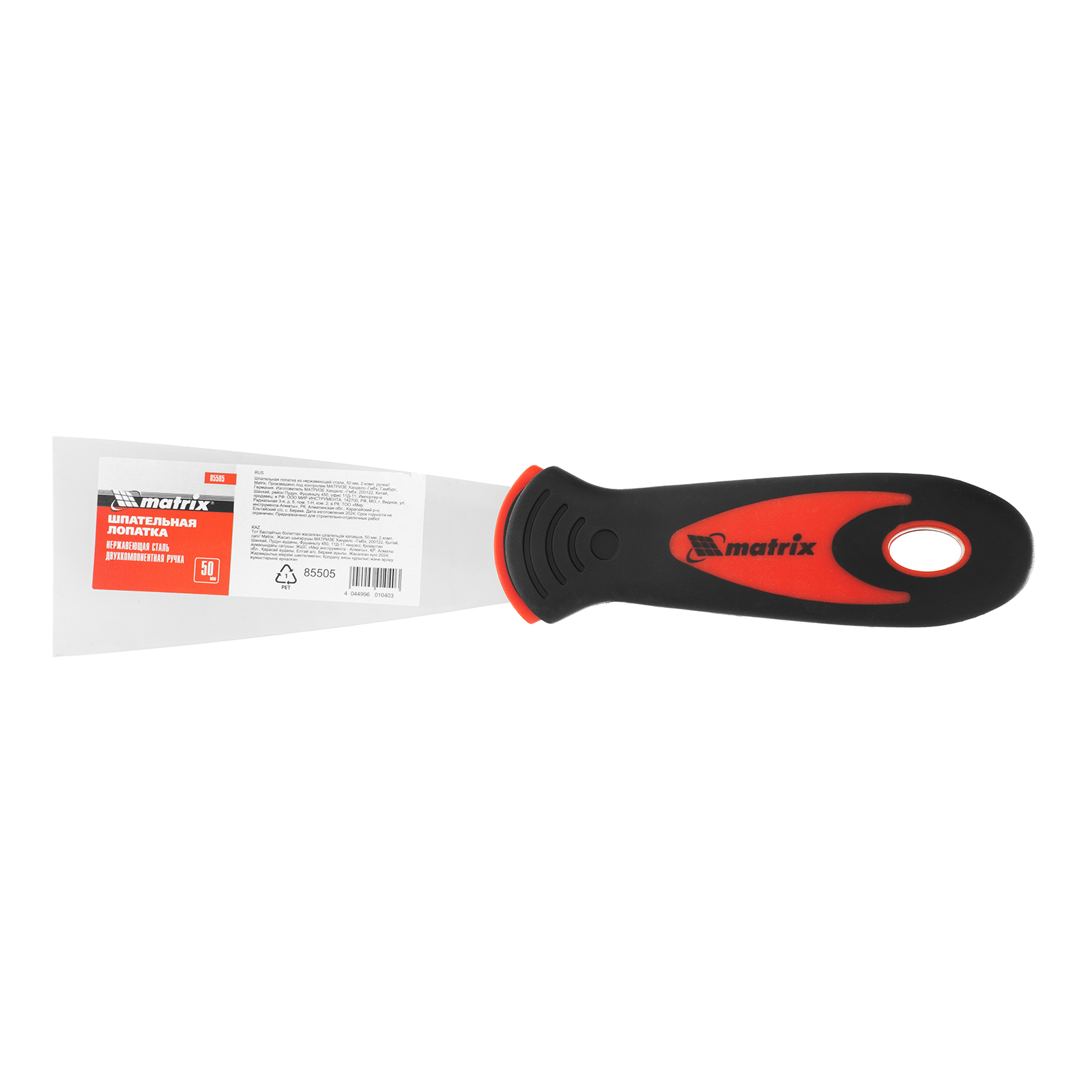 Шпательная лопатка из нержавеющей стали Matrix 85505 шириной 50 мм, с двухкомпонентной рукояткой, предназначена для нанесения и выравнивания строительных смесей, шпаклевания швов, заполнения трещин, удаления старых обоев. За счет компактных размеров инструмент подходит для корректировки мелких трещин и неровностей.