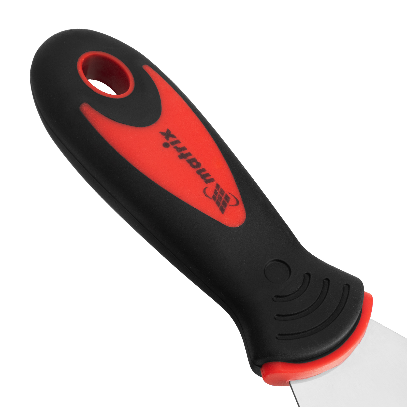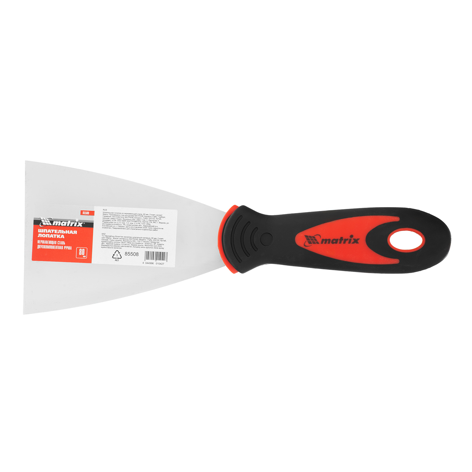 Шпательная лопатка из нержавеющей стали Matrix 85508 шириной 80 мм, с двухкомпонентной рукояткой, предназначена для нанесения и выравнивания строительных смесей, шпаклевания швов, заполнения трещин, удаления старых обоев. За счет компактных размеров инструмент подходит для корректировки мелких трещин и неровностей.