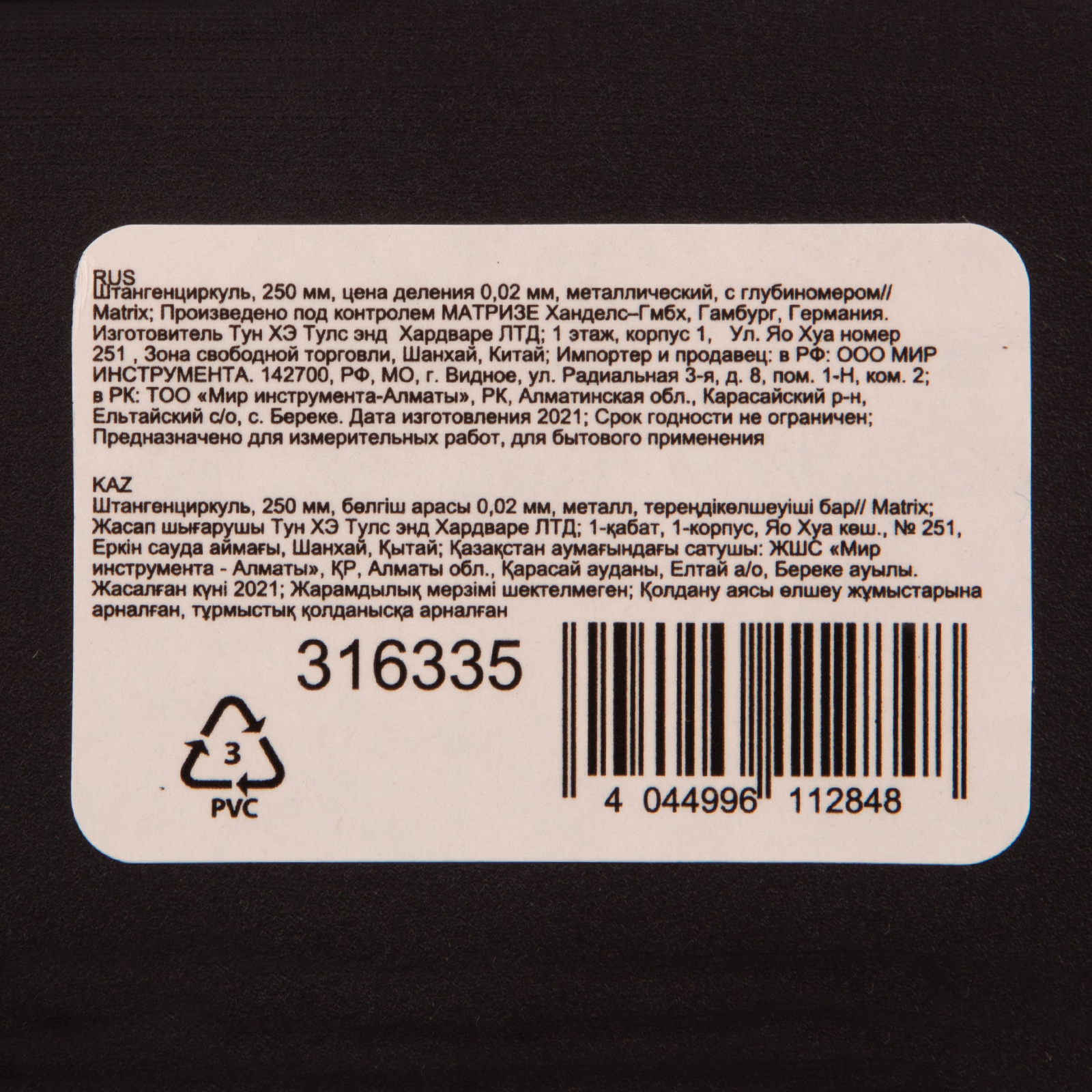 <p>Металлический штангенциркуль с глубиномером Matrix 316335, 250 мм, со значением отсчета по нониусу 0,02 мм, используется для быстрого определения размеров внутри и снаружи деталей, а также глубин отверстий и канавок — для этого предусмотрен глубиномер. Погрешность составляет ±0,02 мм при измерении размеров до 100 мм, и ±0,03 мм — свыше 100 мм. Измерительный инструмент используется в токарном, слесарном деле, будет полезен на производственном предприятии, а также дома или в гараже.</p><h2>Преимущества</h2><ul><li>Надежность — штангенциркуль изготовлен из углеродистой стали, устойчивой к механическим воздействиям.</li><li>Точное позиционирование губок — зажимной винт позволяет зафиксировать подвижную рамку, чтобы она не сместилась во время измерения.</li><li>Удобное хранение и транспортировка — штангенциркуль упакован в прочный пластиковый кейс.</li></ul>