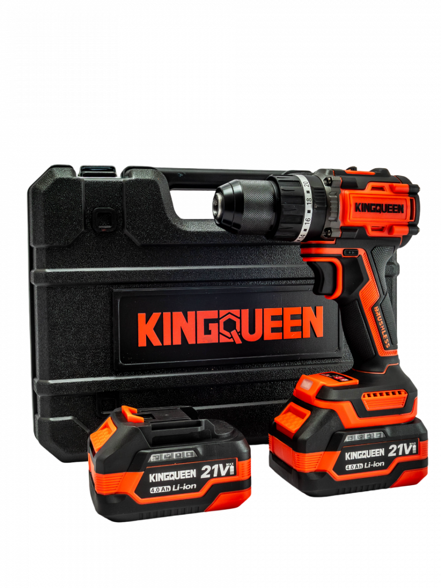 В комплекте с инструментом идут два аккумулятора, что значительно увеличивает время автономной работы и минимизирует перерывы на зарядку. Компактный и эргономичный дизайн шуруповерта KINGQUEEN делает его удобным в использовании, а легкий вес позволяет работать длительное время без усталости.
