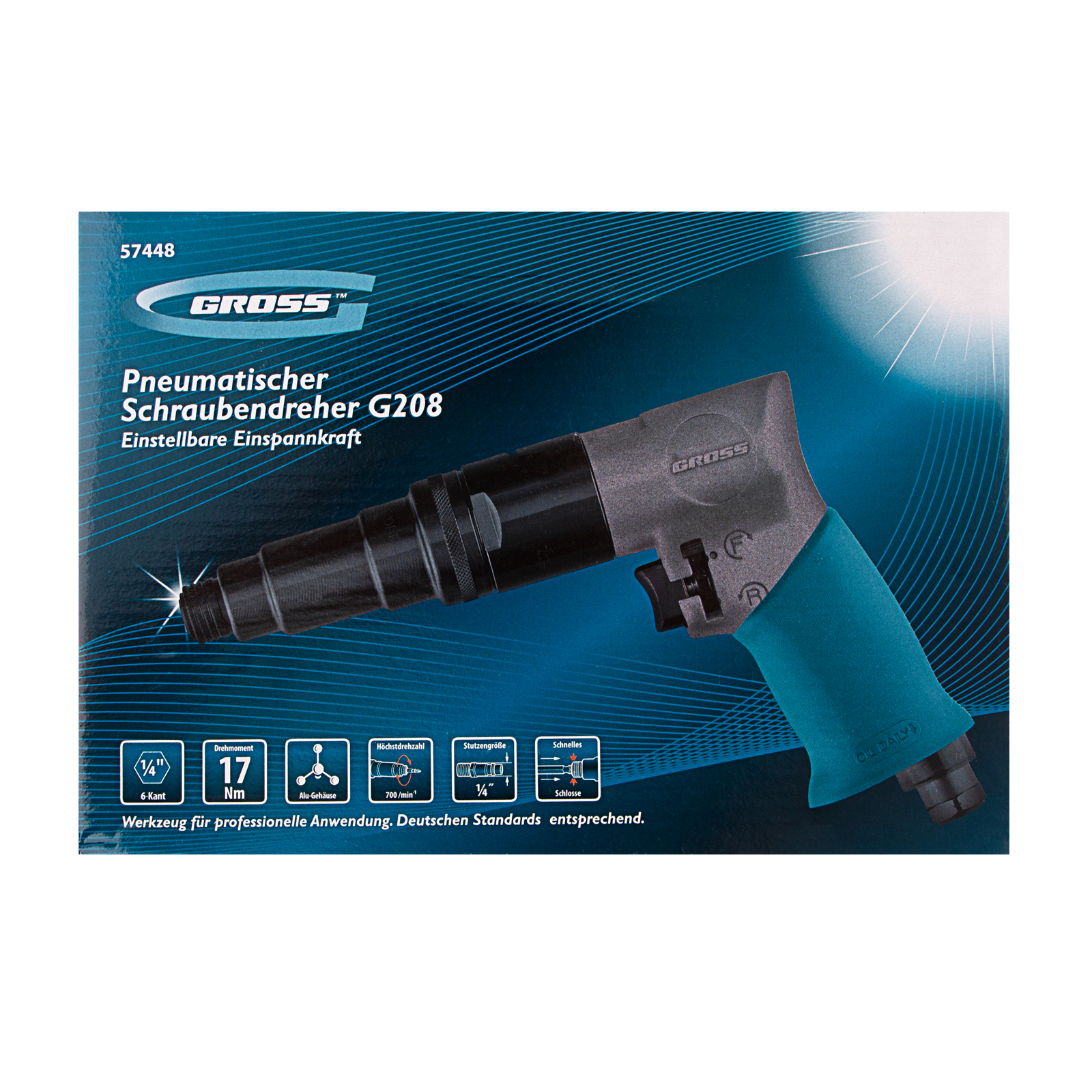 Пневматический шуруповерт Gross G208 57448 с присоединительным размером 1/4″, максимальным крутящим моментом 17 Нм и скоростью вращения шпинделя 700 об/мин, используется для демонтажа старых крепежей и вкручивания новых. Высокая производительность инструмента позволяет быстро справляться с работой. Расход воздуха составляет 212 л/мин, поэтому пневмошуруповерт можно подключить к компрессору средней мощности. Инструмент легко выдерживает интенсивные нагрузки и может долго работать без остановки, поэтому будет полезен не только в быту, но и на строительной площадке.