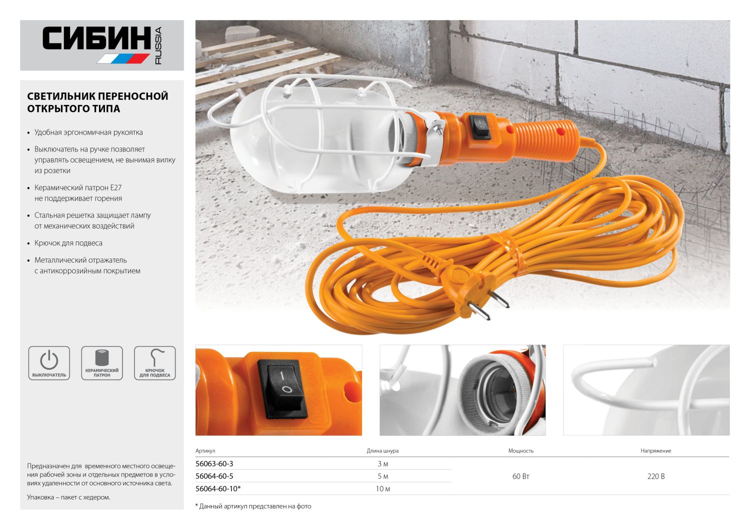 Светильник переносной предназначен для временного местного освещения рабочей зоны и отдельных предметов в условиях удаленности от основного источника света.