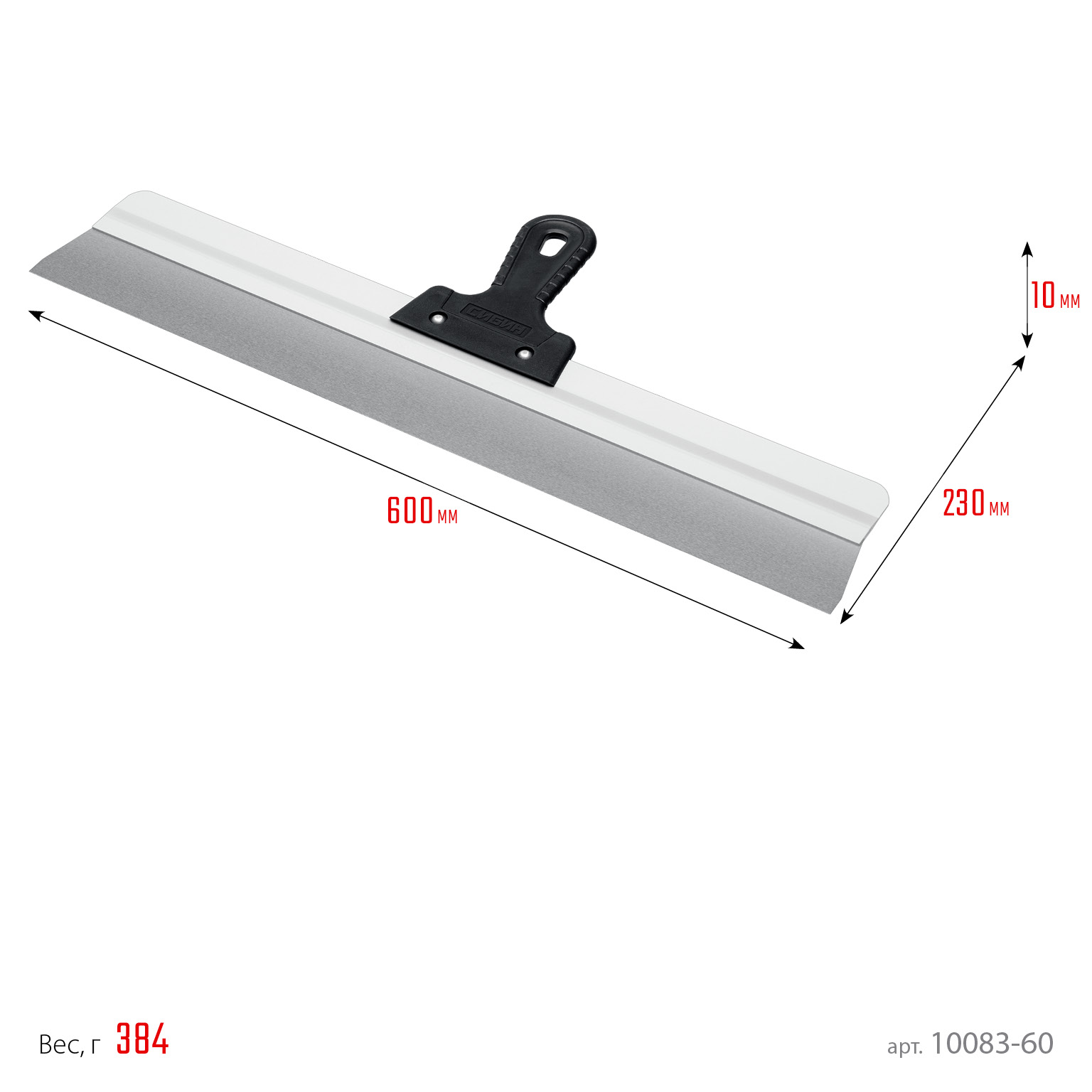 Шпатель СИБИН - отличный выбор для строительства и ремонта! Полотно из нержавеющей стали обеспечивает надежность и долгий срок службы инструмента, алюминиевая направляющая предотвращает изгиб полотна, а эргономичная однокомпонентная рукоятка создает условия для комфортной работы.