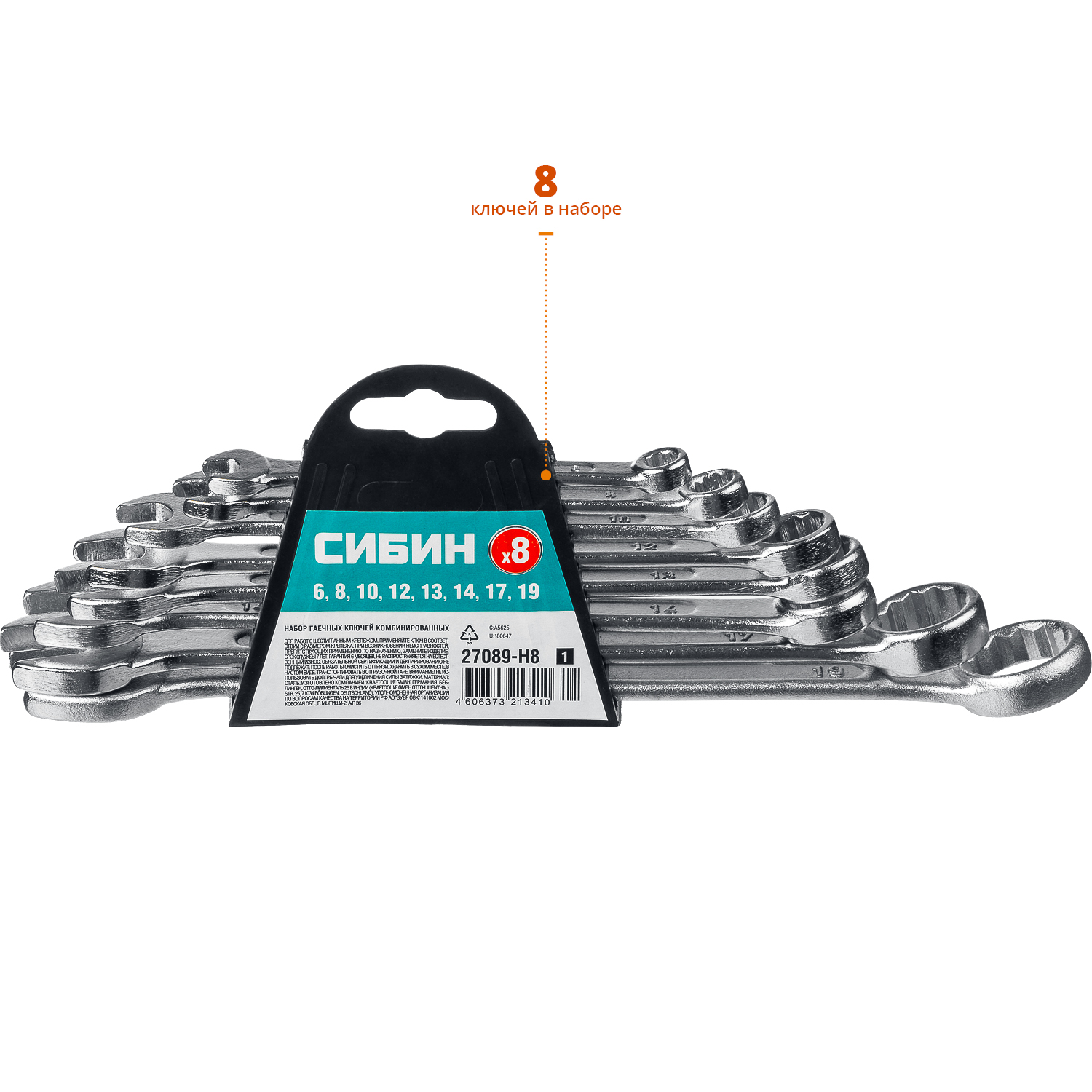 СИБИН 8 шт, 6 - 19 мм, набор комбинированных гаечных ключей (27089-H8)