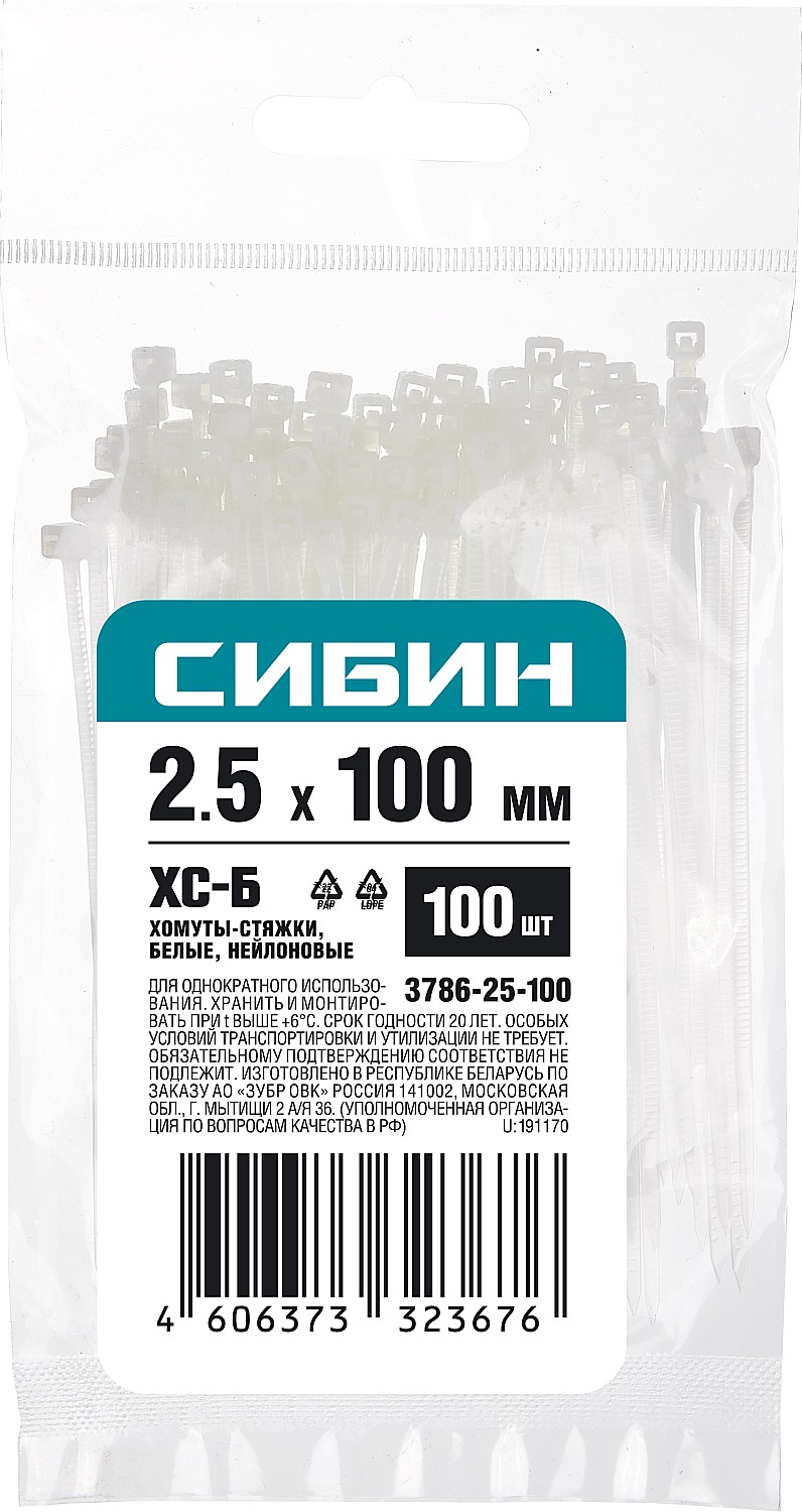 СИБИН ХС-Б, 2.5 x 100 мм, нейлон РА66, 100 шт, белые, хомуты-стяжки (3786-25-100)