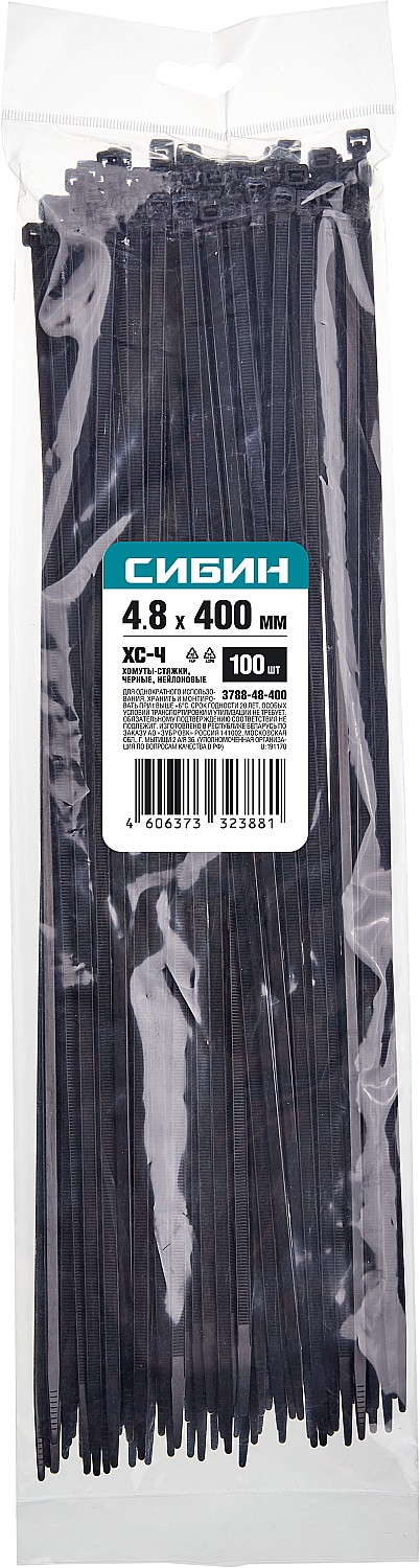 СИБИН ХС-Ч, 4.8 x 400 мм, нейлон РА66, 100 шт, черные, хомуты-стяжки (3788-48-400)