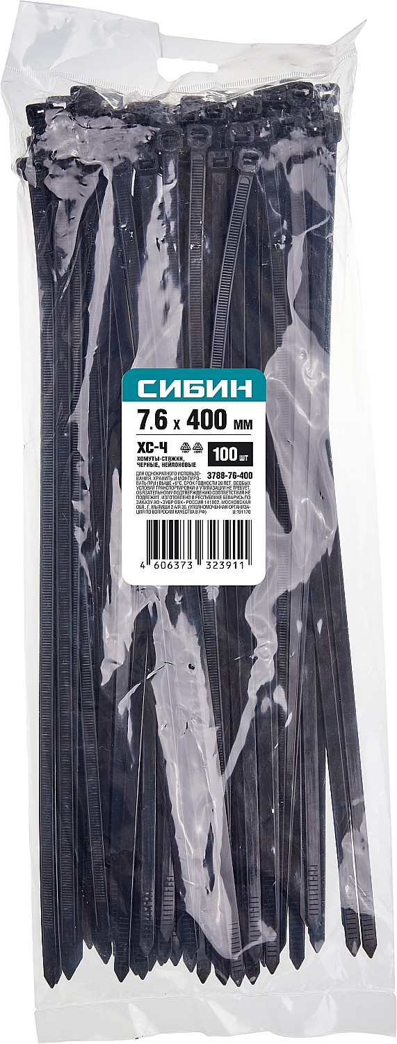 СИБИН ХС-Ч, 7.6 x 400 мм, нейлон РА66, 100 шт, черные, хомуты-стяжки (3788-76-400)