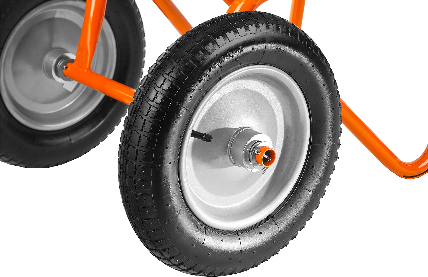 Отличается прочной конструкцией, большой грузоподъемностью, хорошей маневренностью и долговечностью. Модель оснашена стальными подшипниками. Применяется для транспортирования различных грузов во время проведения строительных работ.