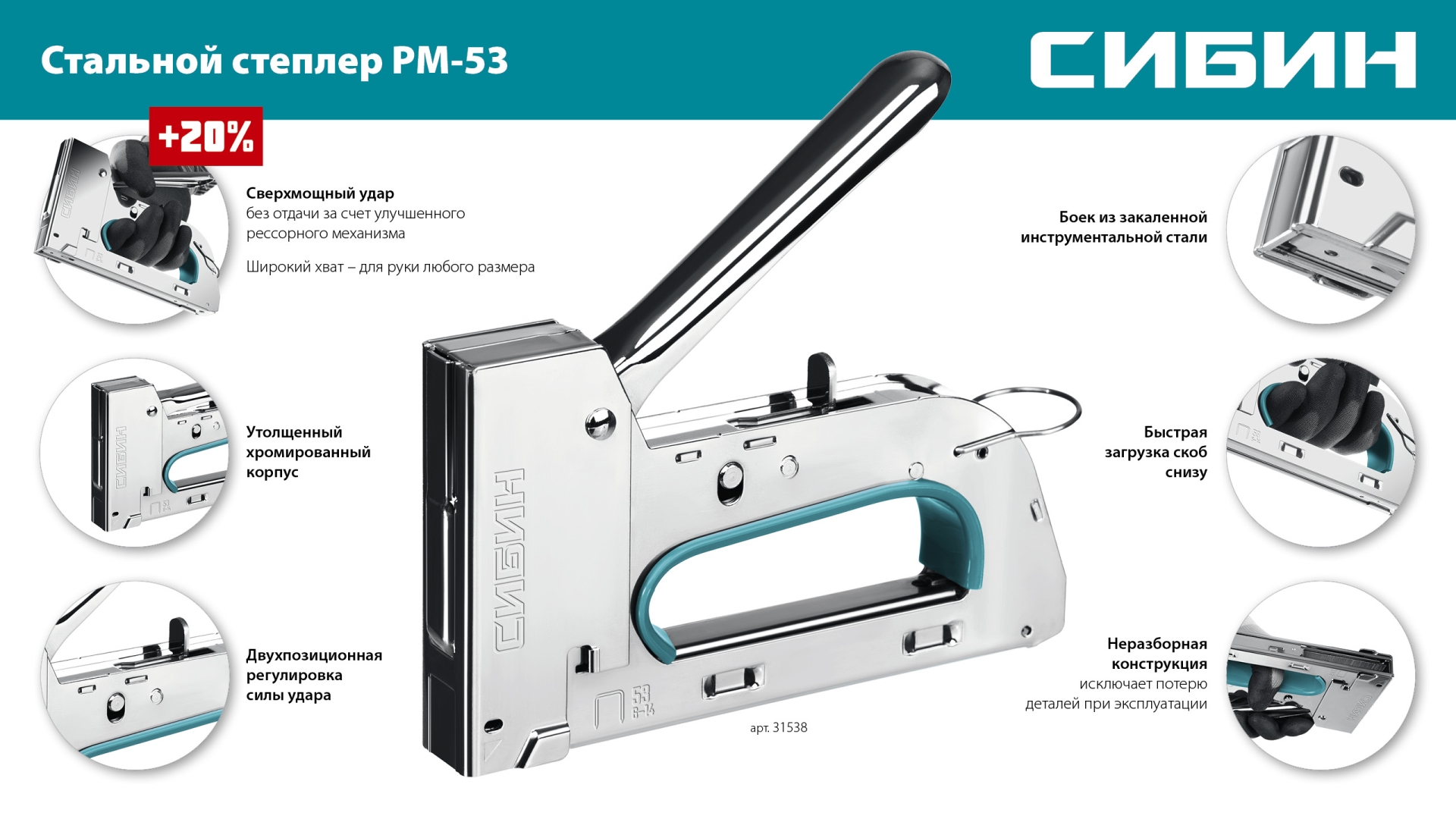 Степлер с ударным механизмом рессорного типа, увеличенная мощность, удар без отдачи.