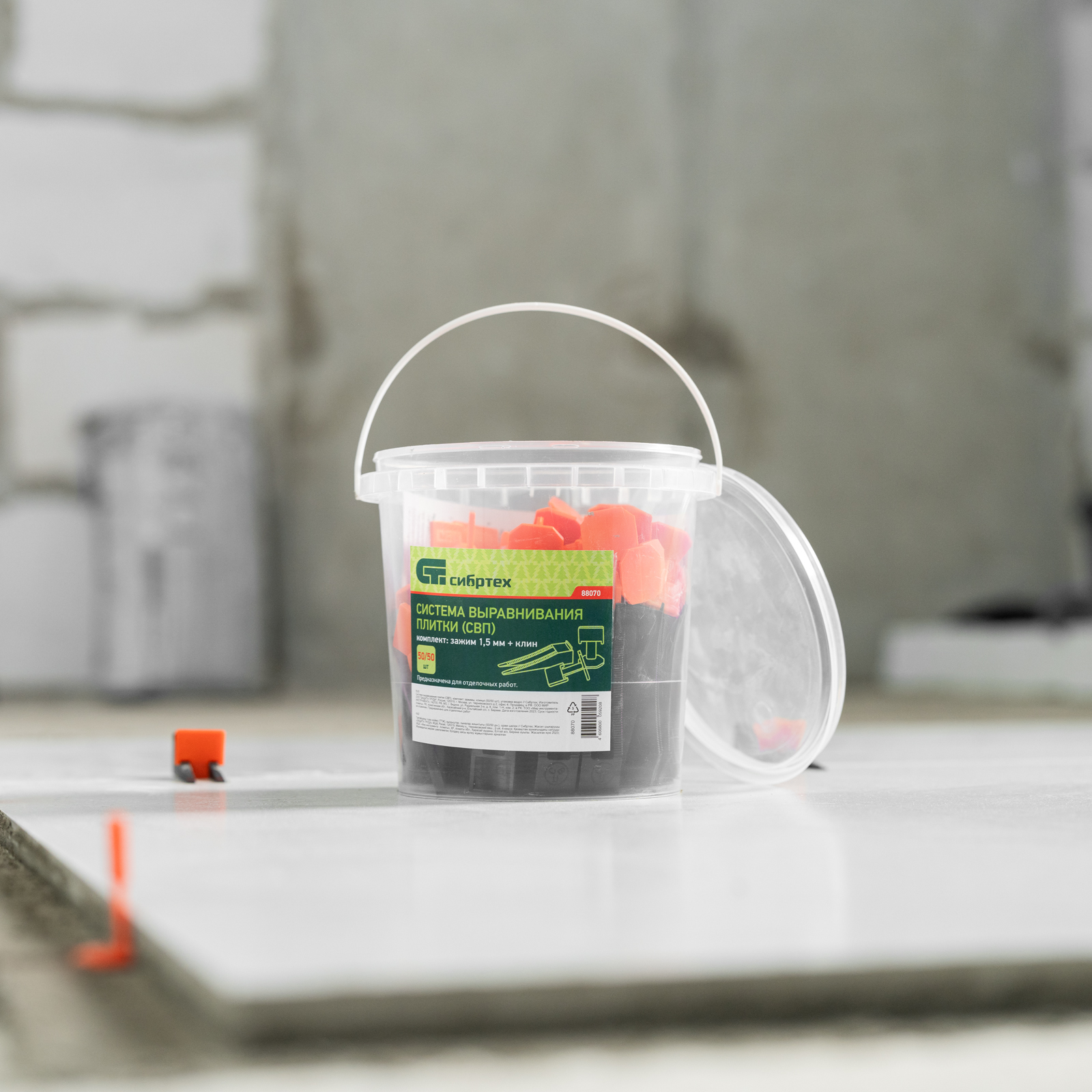 Система выравнивания плитки (СВП) Сибртех 88070 включает в комплект все необходимое: зажимы и клинья (50/50 шт., упаковка — ведро) для керамической и керамогранитной плитки толщиной 6-12 мм. Изделия предотвращают смещение плитки и гарантируют получение идеально ровных, аккуратных швов. Зажимы для плитки (СВП) предназначены для формирования швов 1,5-1,7 мм.