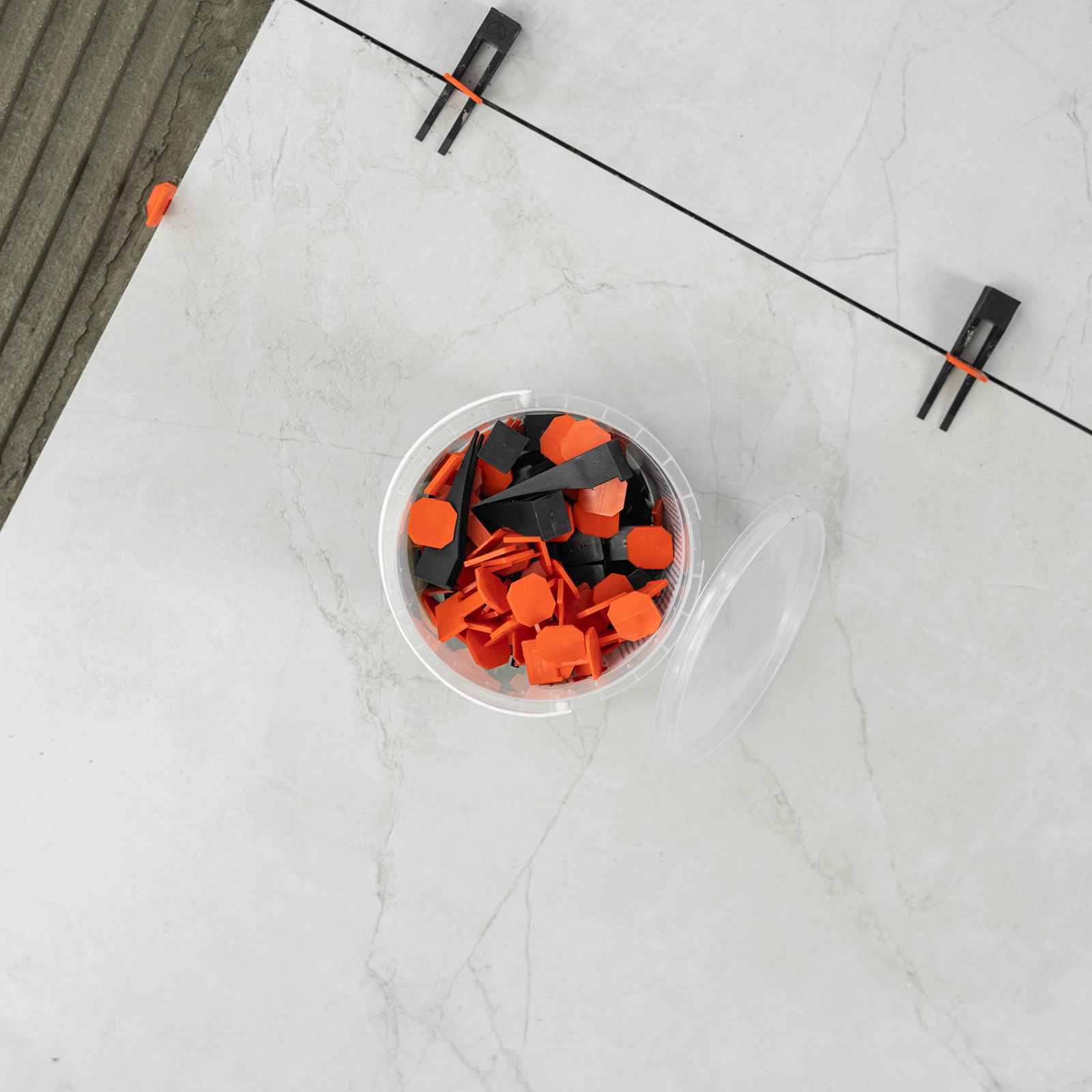 - Качественный пластик — клинья для системы выравнивания плитки подходят для многоразового применения.