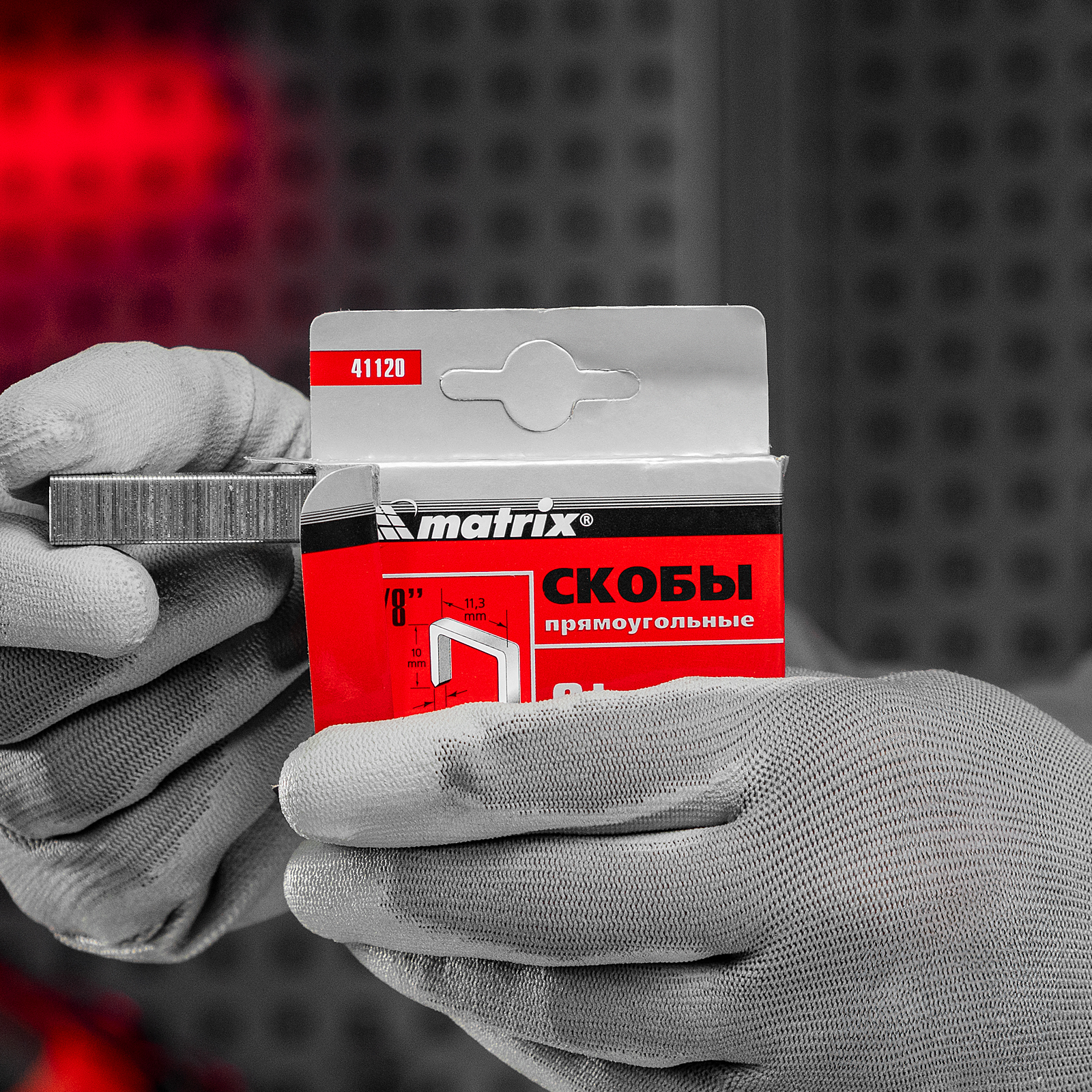 <p>Скобы Matrix 41120 размером 10 х 11,3 х 1 мм, тип 53, 1000 шт. в упаковке, предназначены для скрепления материалов при помощи мебельного степлера. Подходят для работы с древесиной, фанерой, картоном, ДСП, оргалитом и т. д. Будут полезны во время ремонтных и отделочных работ, пригодятся для обшивки мебели.</p><h2>Преимущества</h2><ul><li>Высокая прочность — стальные скобы можно использовать не только с мягкими, но и твердыми материалами.</li><li>Защита от коррозии — оцинкованные изделия не разрушаются под воздействием влаги.</li><li>Универсальность — расходники совместимы со степлерами Matrix 40902, 40903, 40907 и аналогичными моделями.</li><li>Комфортная работа — скобы с заостренными наконечниками легко вбиваются в материал.</li><li>1000 шт. в коробке — одной упаковки хватит на большой объем работ.</li></ul>