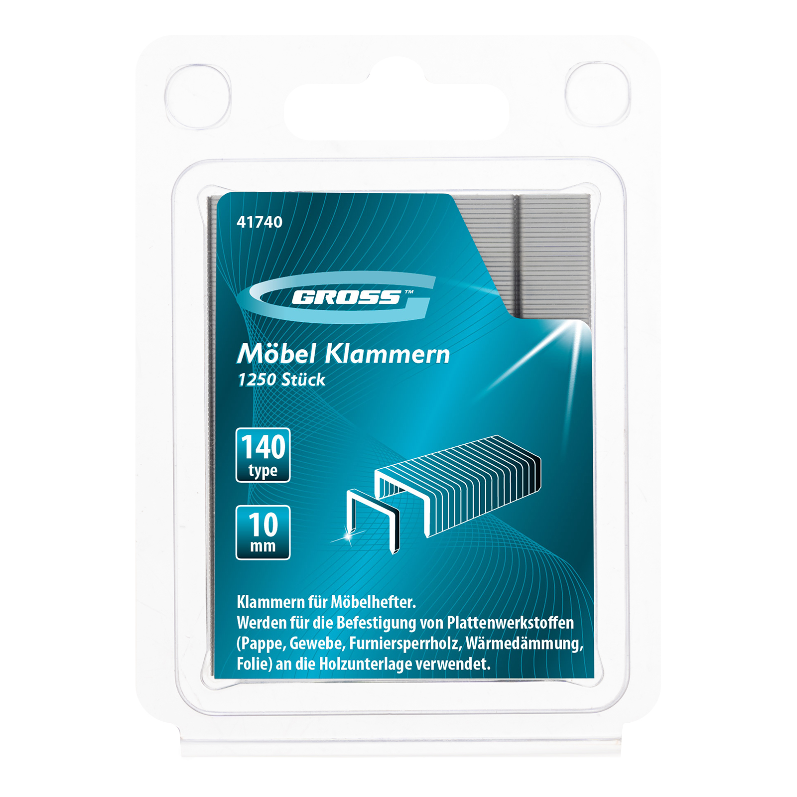 Усиленные скобы Gross 41740 размером 10 х 10,5 х 1,2 мм, тип 140, 1250 шт. в упаковке, предназначены для скрепления листовых материалов с помощью мебельного степлера. Позволяют зафиксировать картон, фанеру, ткань в ходе проведения облицовочных или ремонтных работ.