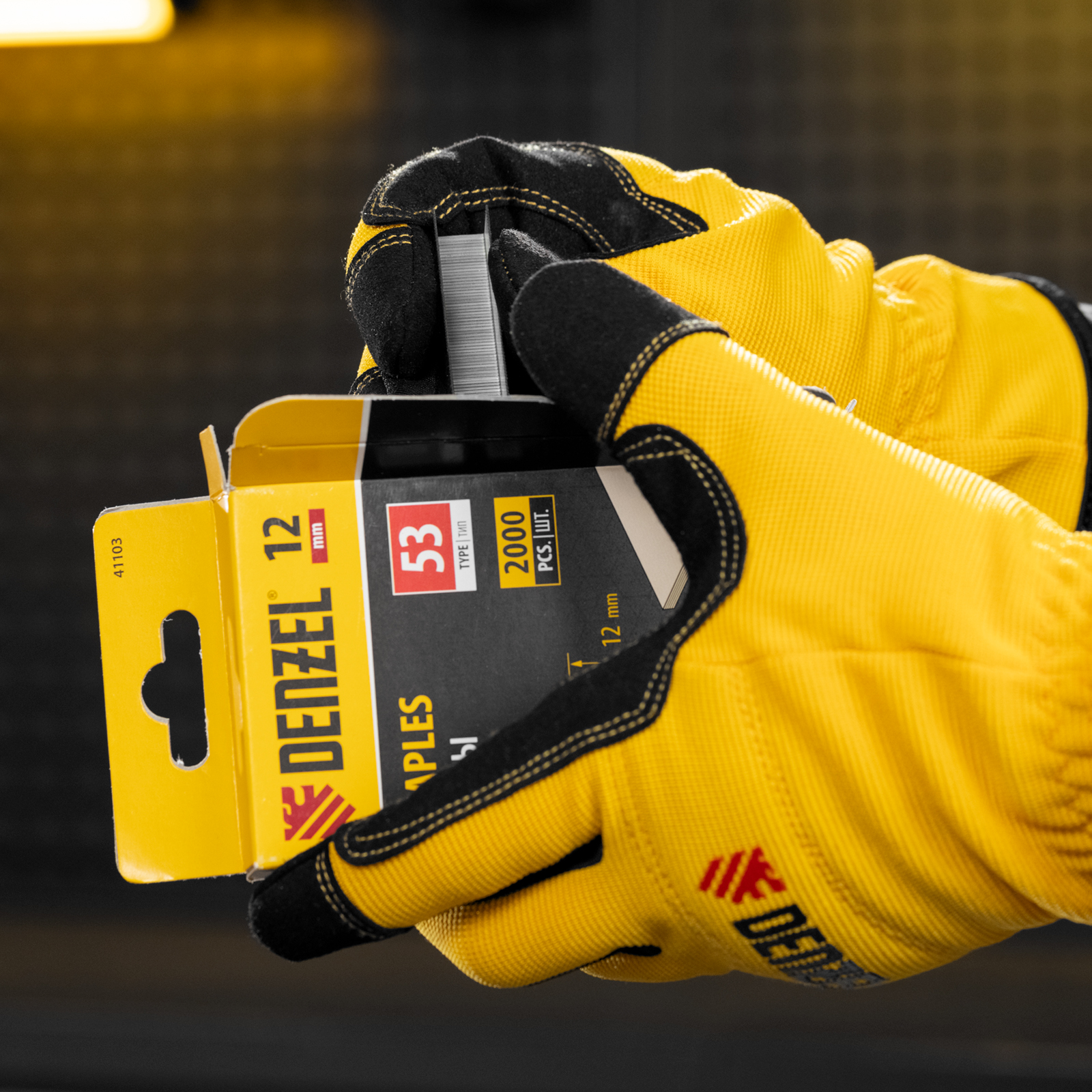 Скобы Denzel 41103 типа 53, высотой 12 мм, 2000 шт. в упаковке, — расходные материалы для мебельного степлера. Универсальные П-образные скобы подходят для фиксации картона, фанеры, ткани, пленки ПВХ, утеплителя и других материалов. Пригодятся для обшивки мебели, укладки утеплителя и выполнения других работ.