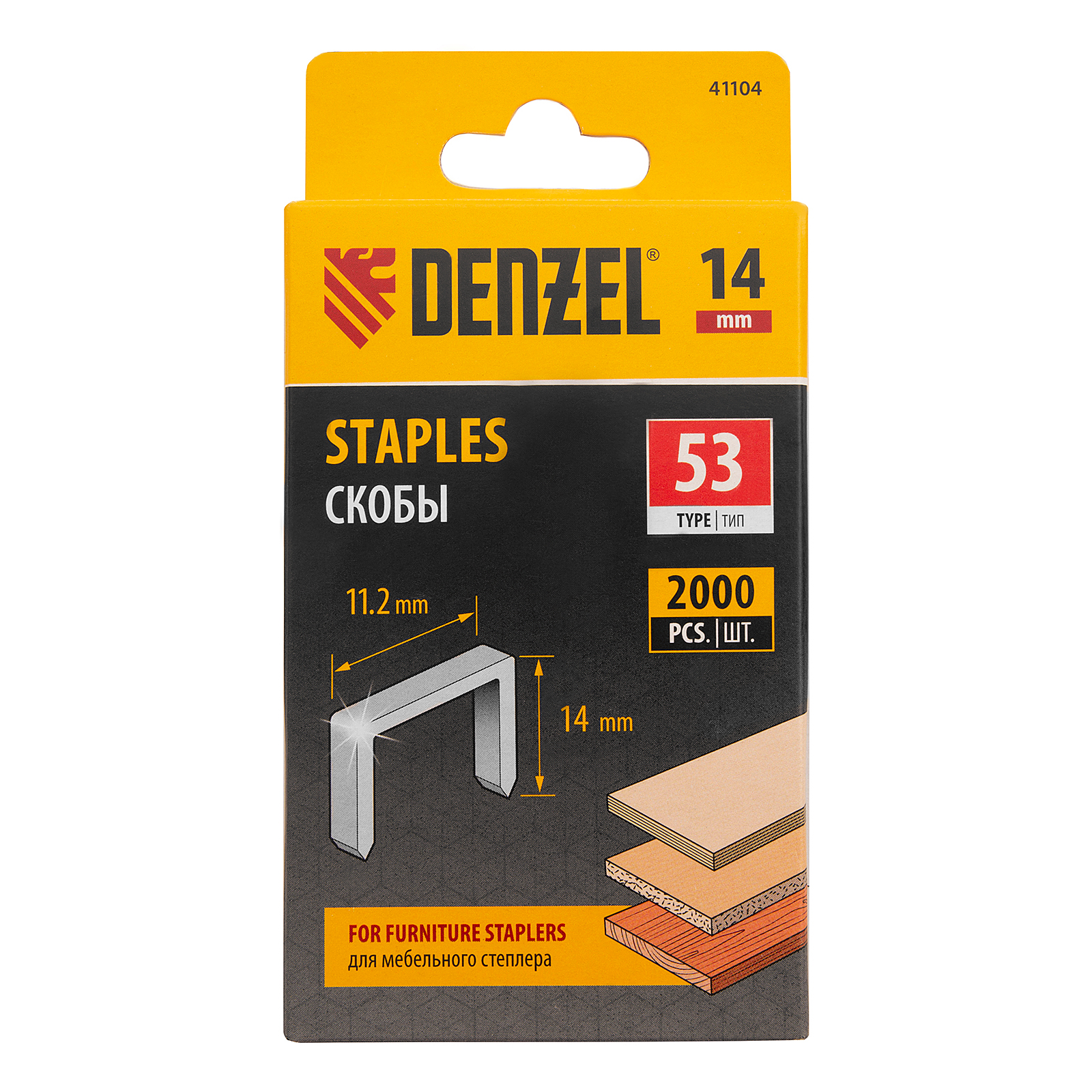 <p>Скобы Denzel 41104 типа 53, высотой 14 мм, 2000 шт. в упаковке, — расходные материалы для мебельного степлера. Универсальные П-образные скобы подходят для фиксации картона, фанеры, ткани, пленки ПВХ, утеплителя и других материалов. Пригодятся для обшивки мебели, укладки утеплителя и выполнения других работ.</p><h2>Преимущества</h2><ul><li>Эффективная работа как с мягкими, так и с твердыми материалами — стальные скобы обладают необходимой твердостью.</li><li>Устойчивость к разрушению — оцинкованные изделия не подвержены коррозии.</li><li>Деформационная стойкость — прочность скоб на растяжение составляет 1150-1300 Н/мм², поэтому они сохраняют форму при вбивании.</li><li>Удобная комплектация — в коробке 2000 скоб, которых хватит для выполнения большого объема работ.</li></ul>