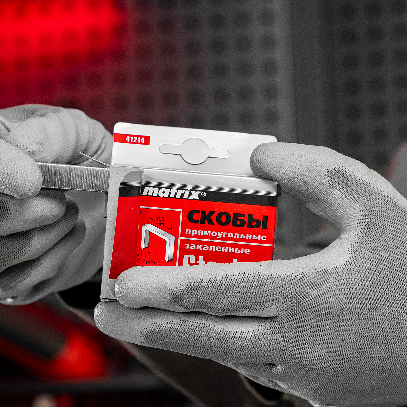 Закаленные скобы Matrix 41214 для мебельного степлера, тип 53, размером 14 х 11,3 х 0,7 мм, 1000 шт. в коробке, помогут обить мебель, зафиксировать утеплитель, а также выполнить другие отделочные и ремонтные работы. Скобы крепко соединяют различные материалы: древесину, фанеру, картон, ДСП.