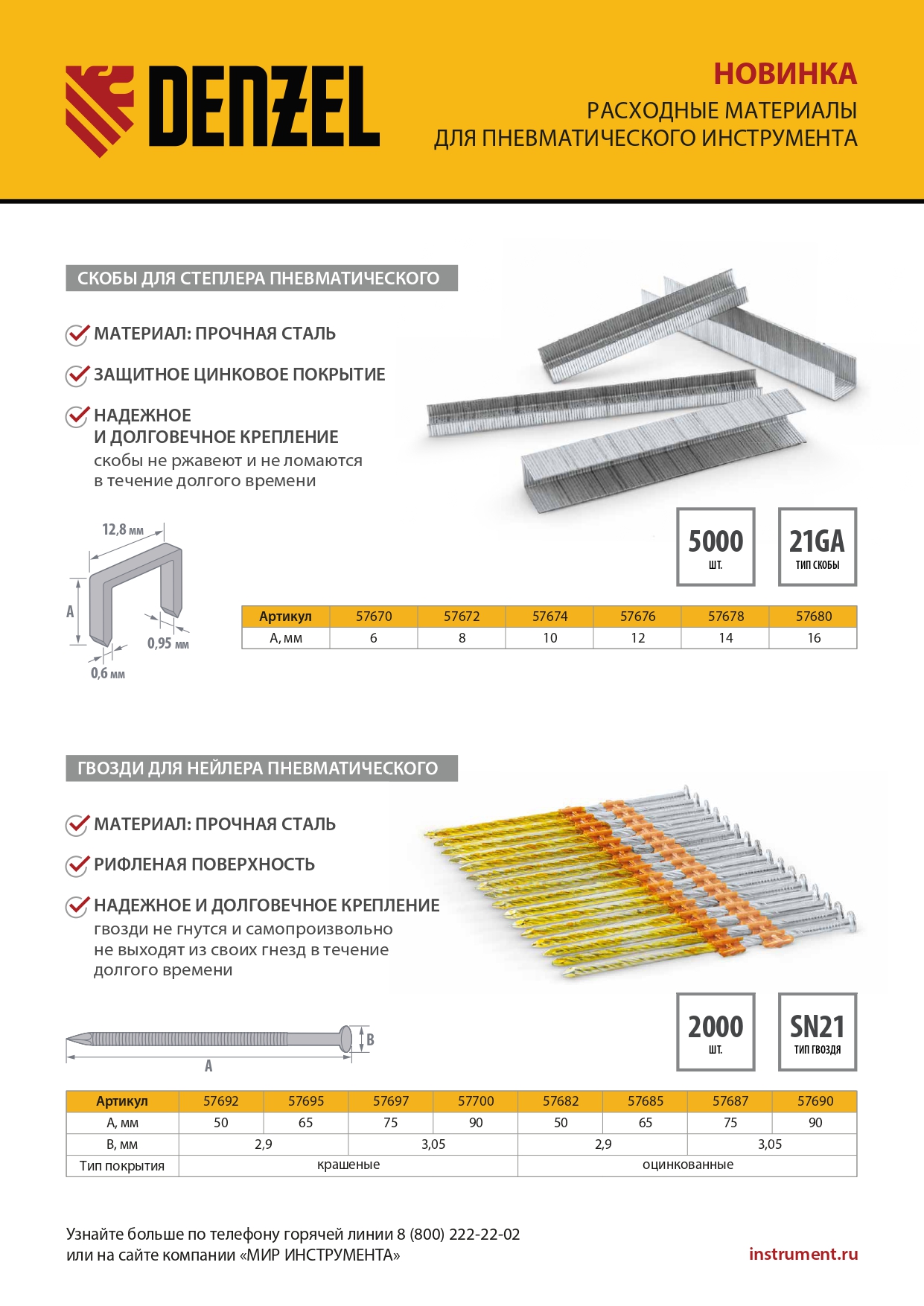 <p>Скобы 21GA Denzel 57678 шириной 12,8 мм, 5000 шт. в упаковке, предназначены для пневматического степлера, совместимого с крепежом размера 14 х 0,95 х 0,6 мм. Используются для крепления листовых материалов к деревянному основанию, подходят для обивки мебели, укладки напольного покрытия, фиксации утеплителя.</p><h2>Преимущества</h2><ul><li>Прочность и долговечность — скобы изготовлены из стали, цинковое покрытие защищает их от коррозии.</li><li>Высокое качество проводимых работ — скобы образуют надежное и долговечное крепление.</li><li>Продуманная комплектация — упаковки из 5000 шт. хватит для выполнения большого объема работ.</li></ul>