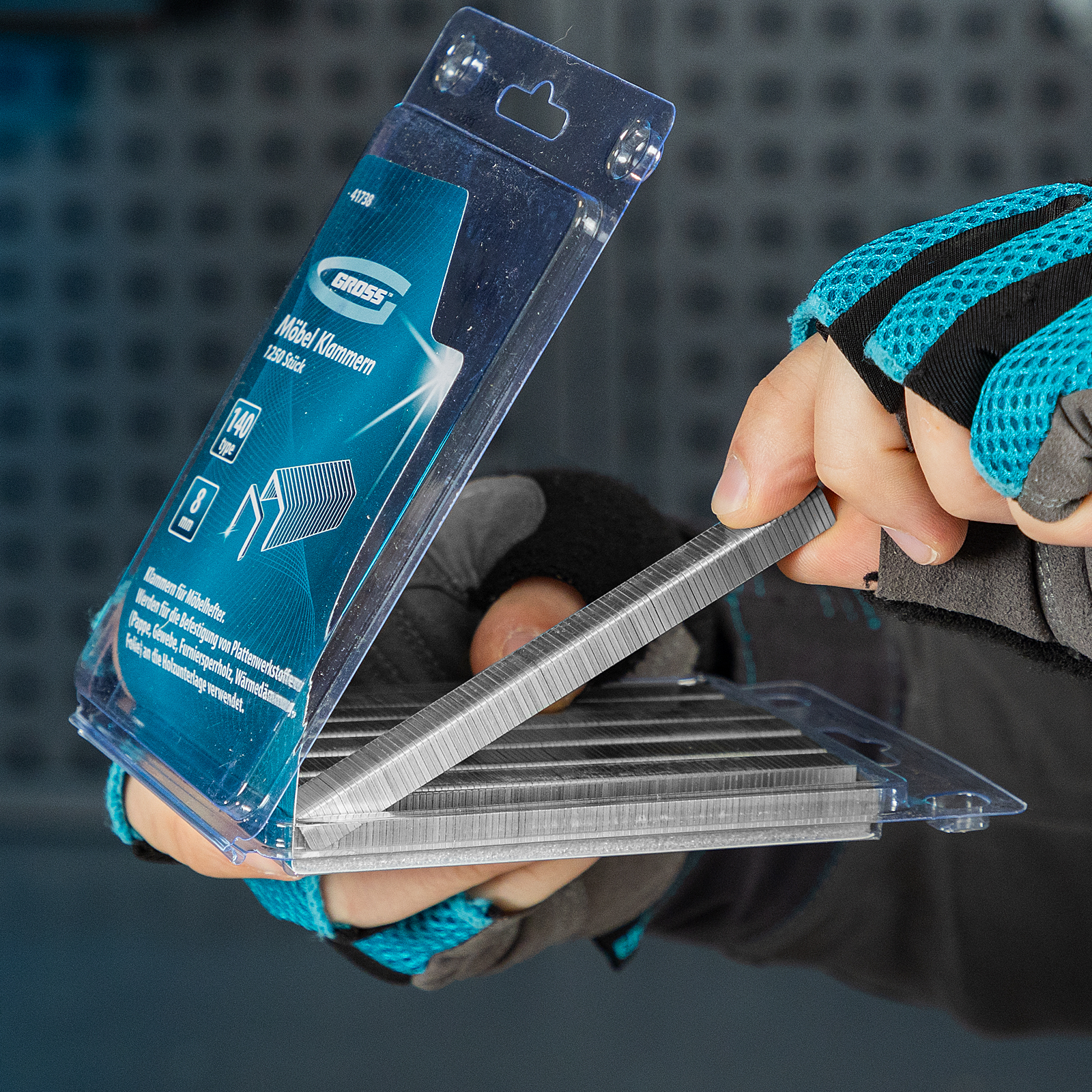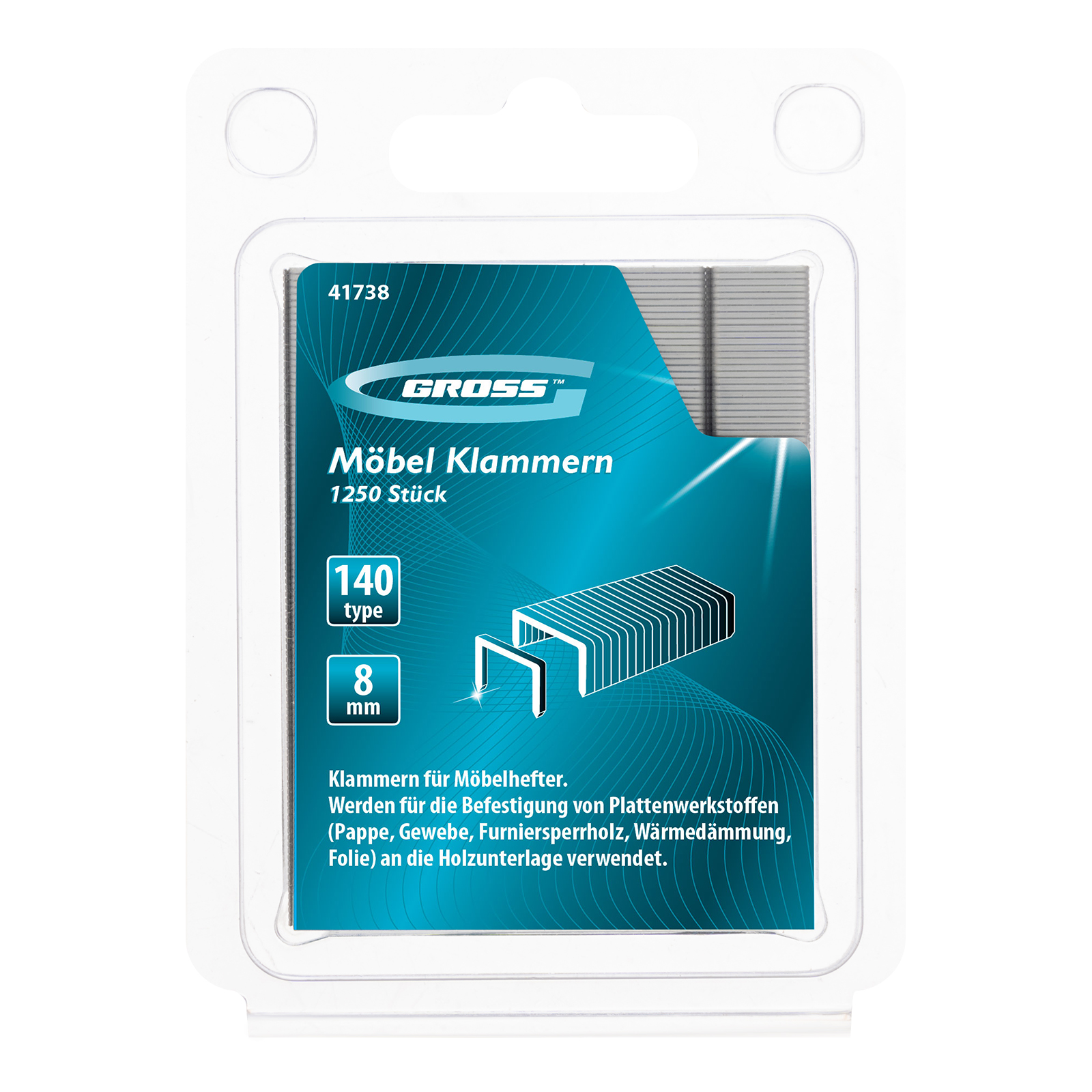 Усиленные скобы Gross 41738 размером 8 х 10,5 х 1,2 мм, тип 140, 1250 шт. в упаковке, предназначены для скрепления листовых материалов с помощью мебельного степлера. Позволяют зафиксировать картон, фанеру, ткань в ходе проведения облицовочных или ремонтных работ.