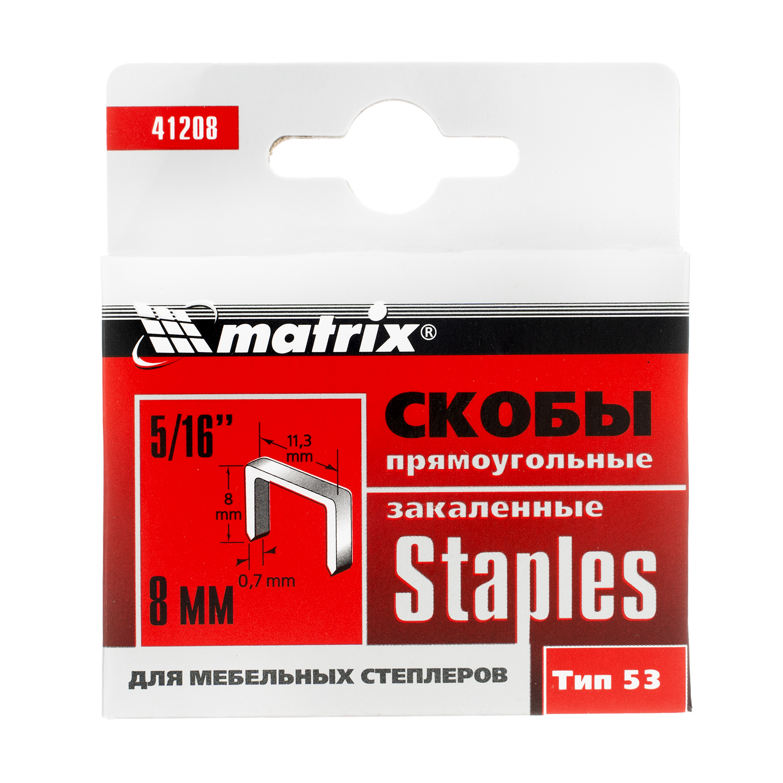 Закаленные скобы Matrix 41208 для мебельного степлера, тип 53, размером 8 х 11,3 х 0,7 мм, 1000 шт. в коробке, помогут обить мебель, зафиксировать утеплитель, а также выполнить другие отделочные и ремонтные работы. Скобы крепко соединяют различные материалы: древесину, фанеру, картон, ДСП.