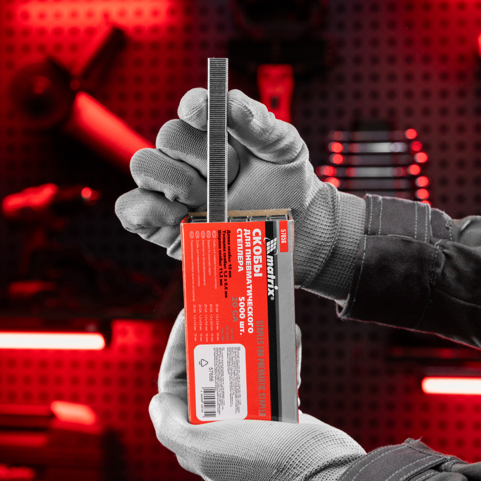 <p>Скобы Matrix 57656 шириной 11,2 мм, 5000 шт. в упаковке, можно использовать с мебельными и строительными пневматическими степлерами, работающими с крепежом размером 10 х 1,2 х 0,6 мм. Они применяются для крепления плинтусов, тканей, пленки и других материалов к деревянным поверхностям.</p><h2>Преимущества</h2><ul><li>Прочность и коррозионная стойкость — скобы изготовлены из стали твердостью 310 HV и имеют предел прочности при растяжении 1100 Н/мм², а никелевое покрытие защищает их от воздействия влаги.</li><li>Эффективная работа — скобы с заостренными концами легко пробивают даже твердые материалы.</li><li>Продуманная комплектация — крепежи, склеенные в блоки, не рассыпаются, а упаковки из 5000 шт. хватит надолго.</li></ul>