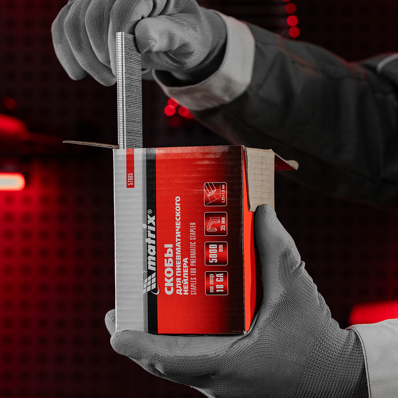 <p>Скобы Matrix 57665 типа 18GA, 5000 шт. в упаковке, предназначены для установки в пневматический степлер, совместимый с крепежами длиной 35, шириной 5,7 мм и сечением 1,25 х 1,0 мм. Применяются для крепления обивочных материалов, кабелей, плинтусов и утеплителей к деревянным поверхностям.</p><h2>Преимущества</h2><ul><li>Прочность и коррозионная стойкость — скобы изготовлены из стали твердостью 310 HV и имеют предел прочности при растяжении 1100 Н/мм², а никелевое покрытие защищает их от воздействия влаги.</li><li>Эффективная работа — скобы с заостренными концами легко пробивают даже твердые материалы.</li><li>Продуманная комплектация — крепежи, склеенные в блоки, не рассыпаются, а упаковки из 5000 шт. хватит надолго.</li></ul>