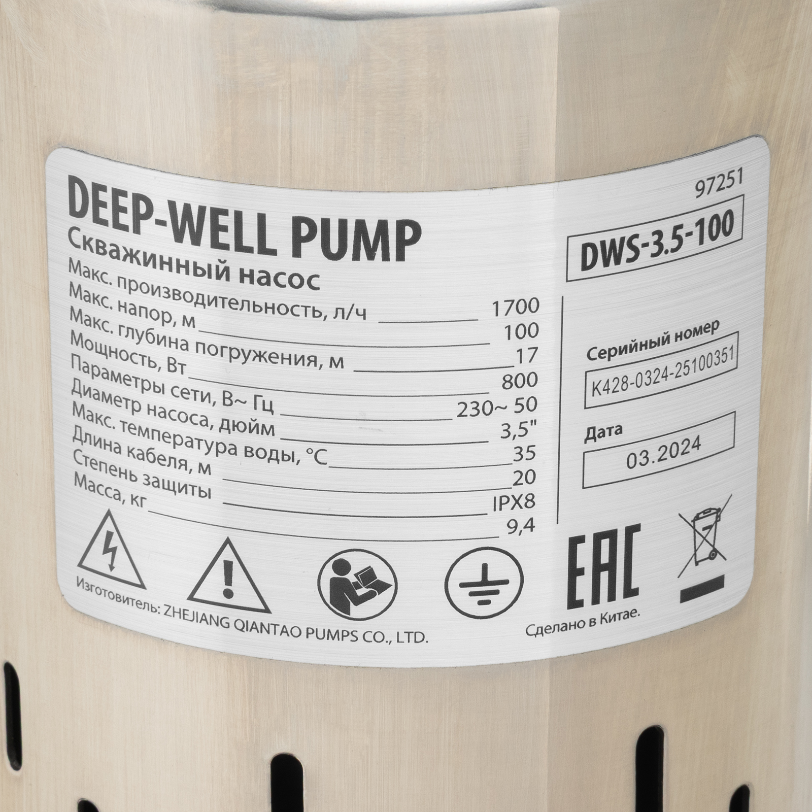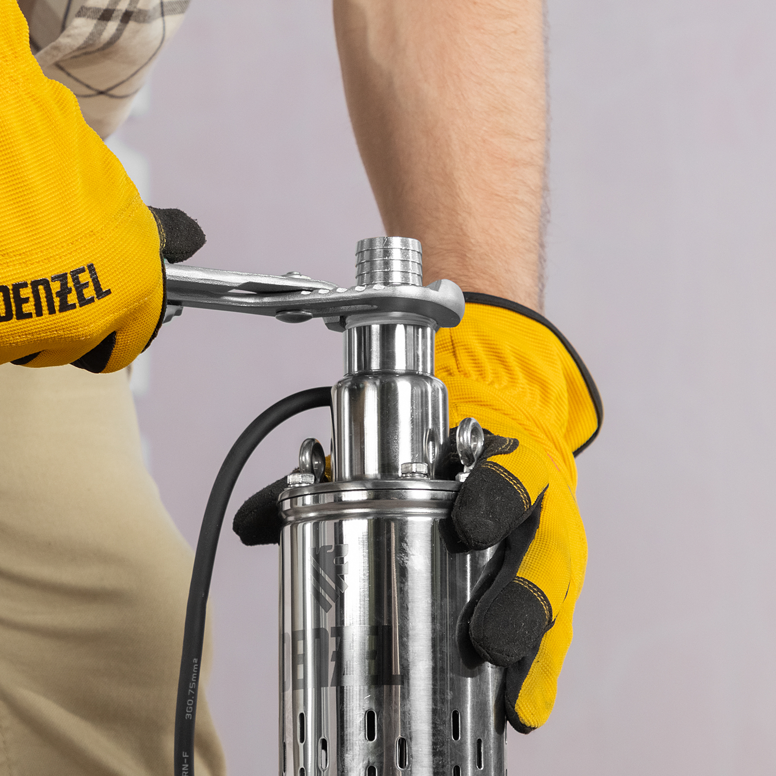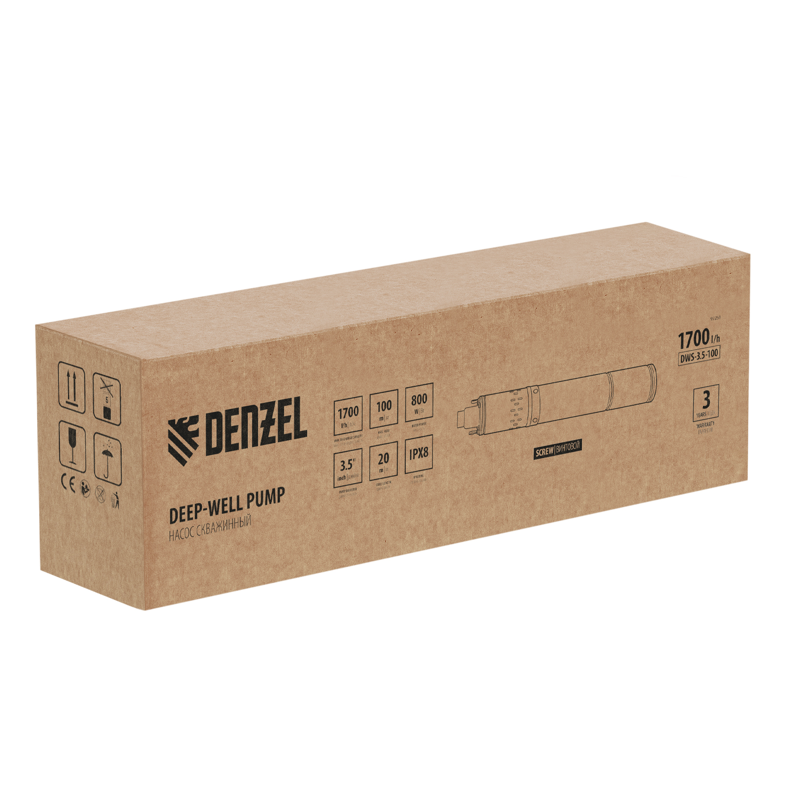 Винтовой скважинный насос Denzel DWS-3,5-100 97251 диаметром 3,5" потребляет мощность 800 Вт, перекачивает воду объемом 1700 л/ч и обеспечивает напор до 100 м при рабочем давлении 10 бар. Предназначен для подъема чистой воды с глубины до 80 м из скважин и колодцев, различных резервуаров и водоемов. Используется для организации систем водоснабжения и орошения на даче, садовом участке или в загородном доме.