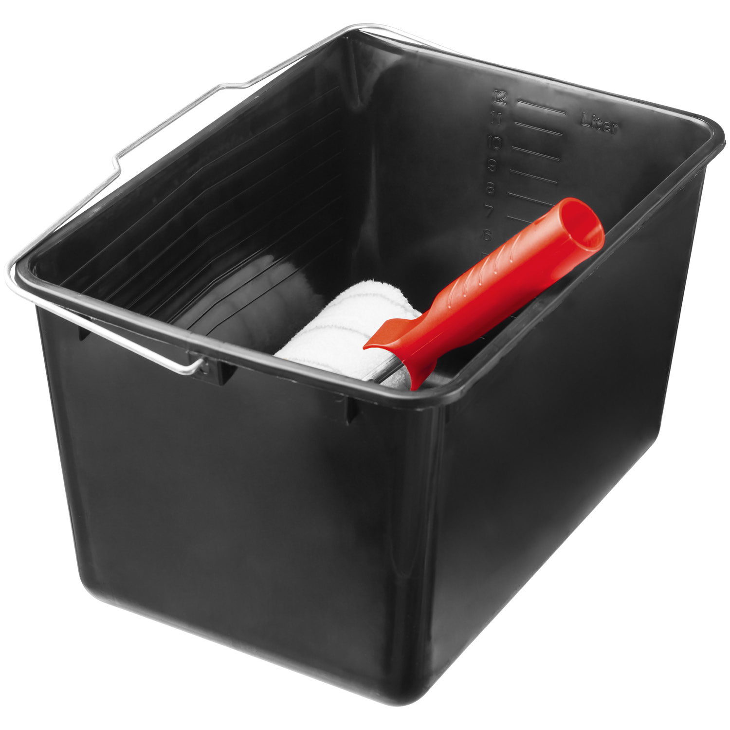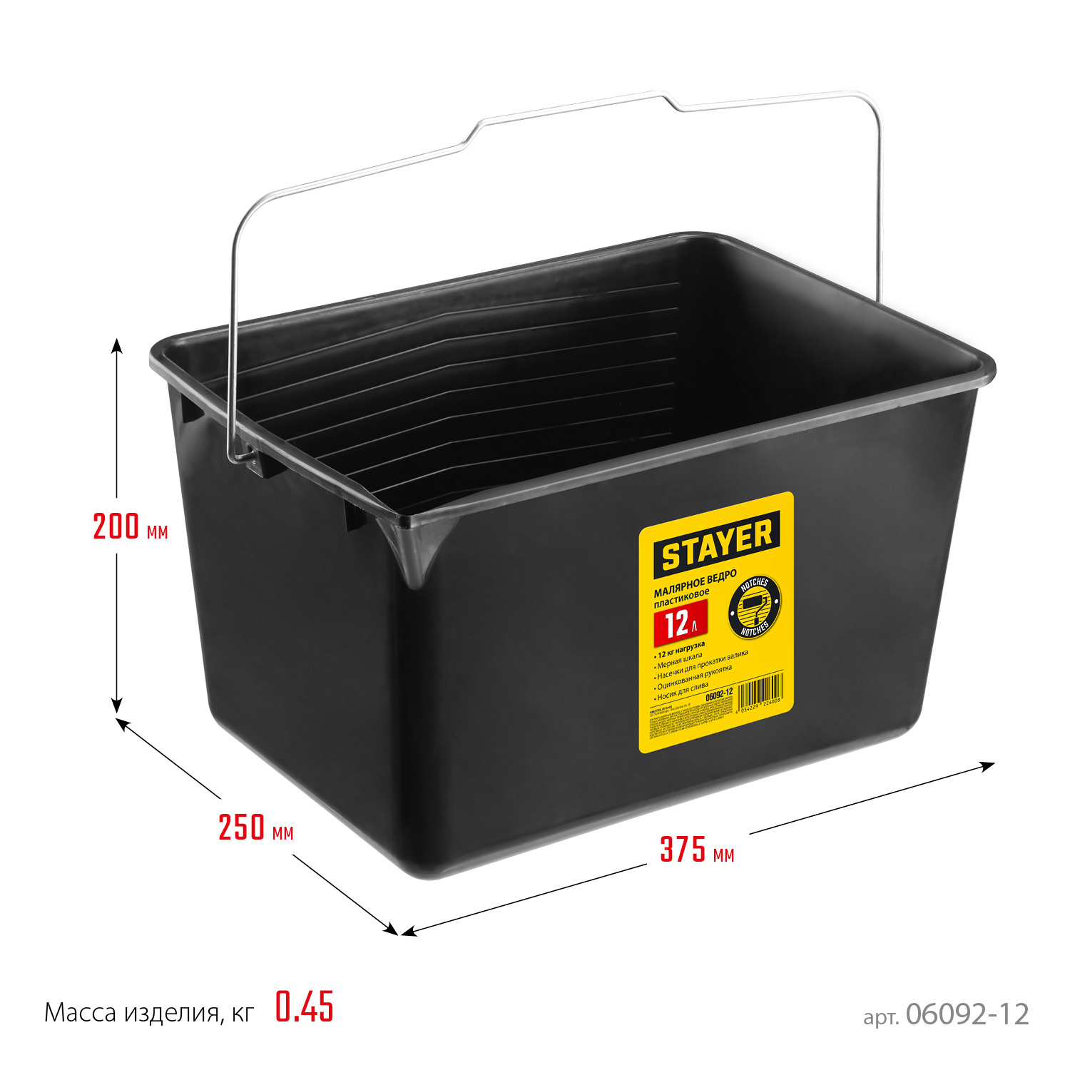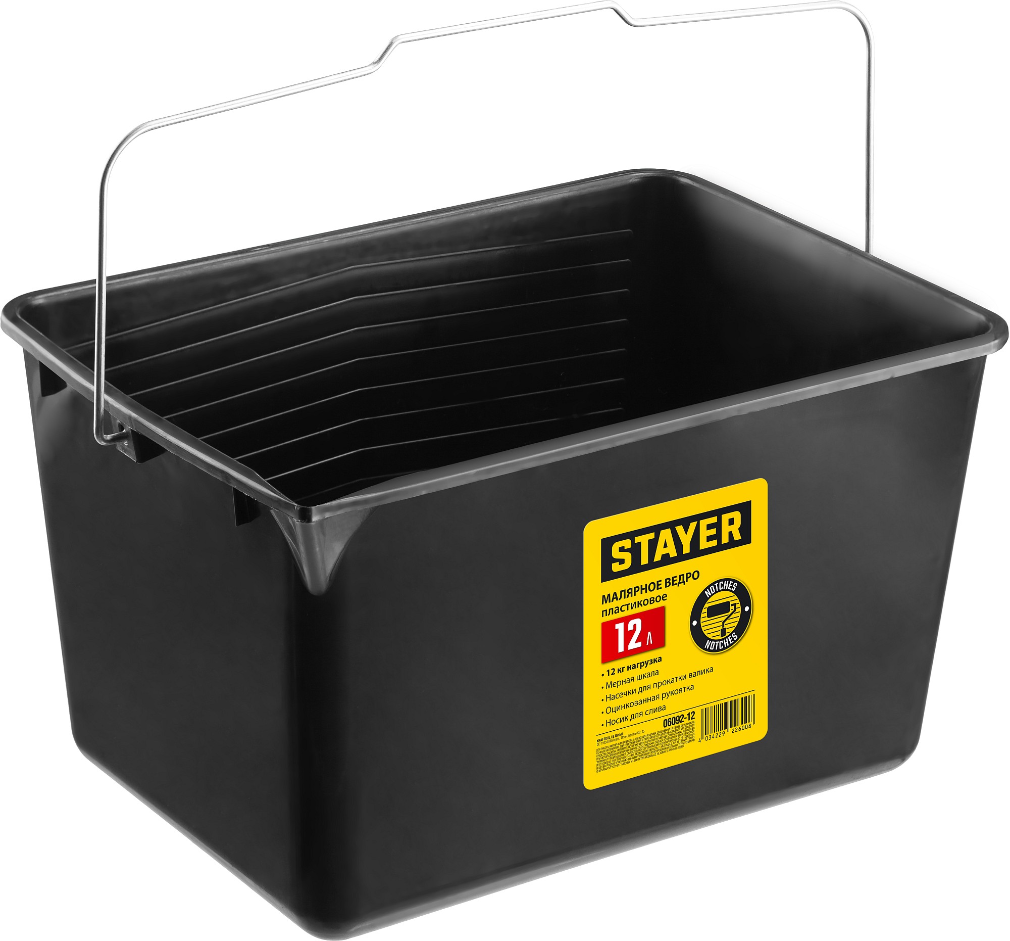 Форма ведра удобна для работы малярным валиком, специальный рельеф на стенке ведра позволит равномерно распределить краску или лак по поверхности валика, а градуировка на стенке повышает точность подбора цвета при смешивании лакокрасочных материалов. Имеет оцинкованную рукоятку и удобный носик для слива.
