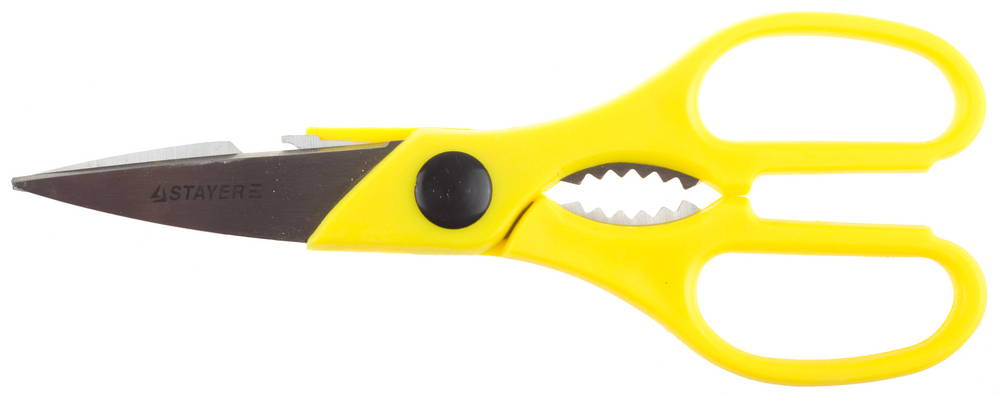 Кухонные ножницы STAYER применяются для разрезания картонных и пластиковых пищевых пакетов, твердых и мягких тканей рыбы, птицы, а так же прочих пищевых продуктов.